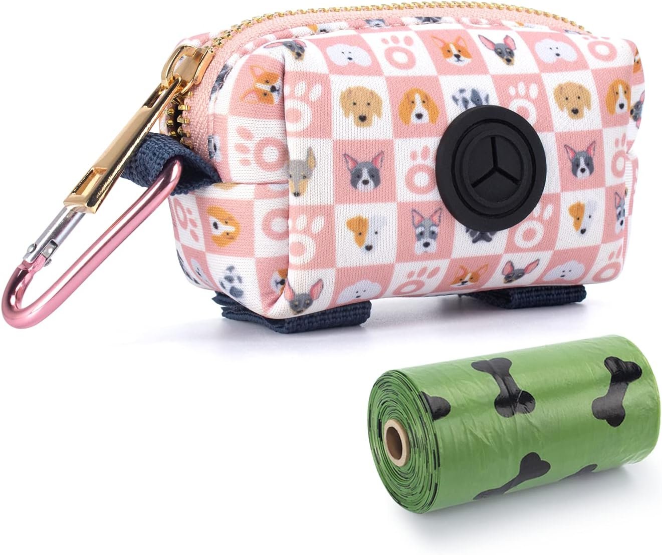 Dog Poop Bag Holder with Leash Attachment – Zippered Waste Bag Dispenser Fits Any Leash, Includes Free Roll, 2 Pack (Pink Rose)