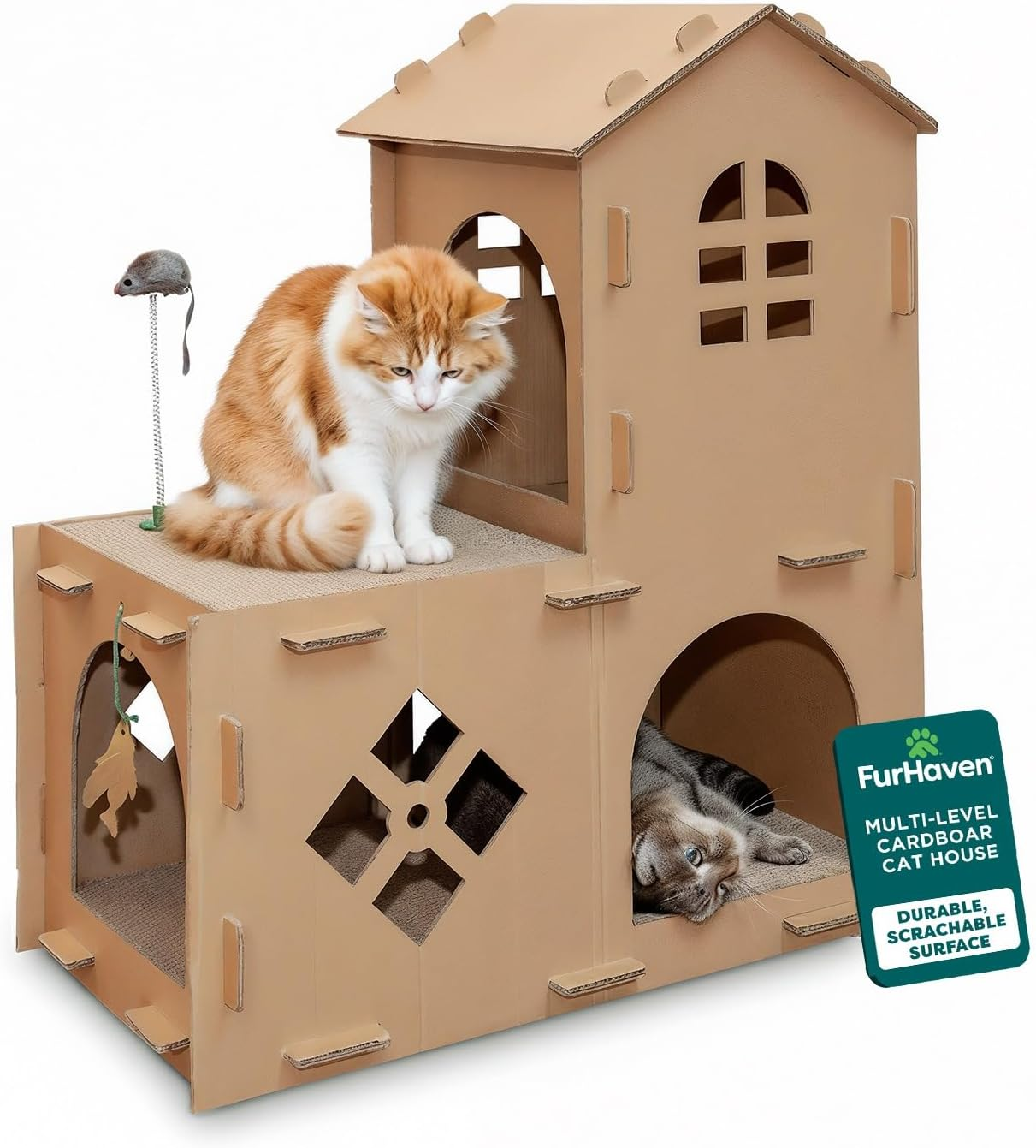 Farmhouse Multi-Level Cardboard Cat House for Indoor Cats with Catnip & Toys, Double-Walled Corrugated Scratcher Designed for Lounging, Play & Comfort, One Size, Cardboard, Brown