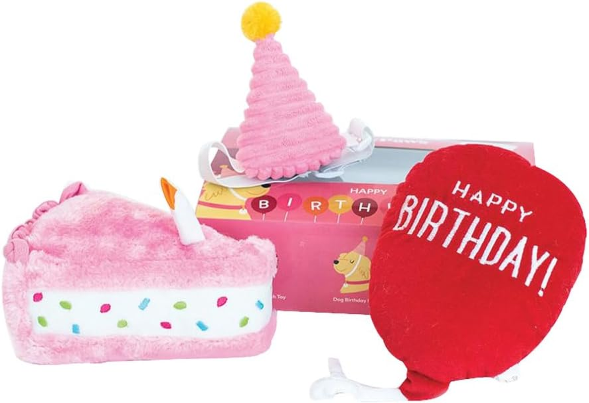 Birthday Box – Dog Squeaky Toys to Keep Them Busy, Funny Food Plush for Small, Medium, & Large Dogs, Cute Stuffed Puppy Toy & Hat, Pet Products, Gift for Dogs of All Breeds – 3-Pack, Pink