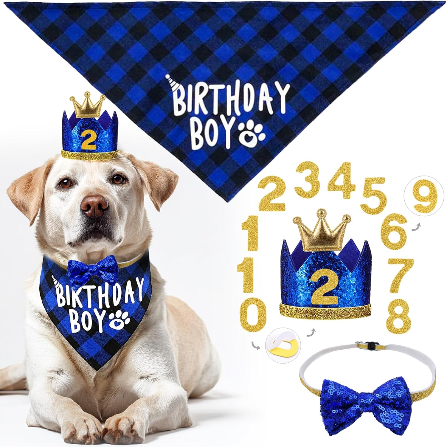 Boy Dog Birthday Party Costume & Decoration Supplies Set Blue Puppy Birthday Hat Crown with Numbers Bandana Scarf with Bow Tie for Medium Large Dogs Pets (M/L)