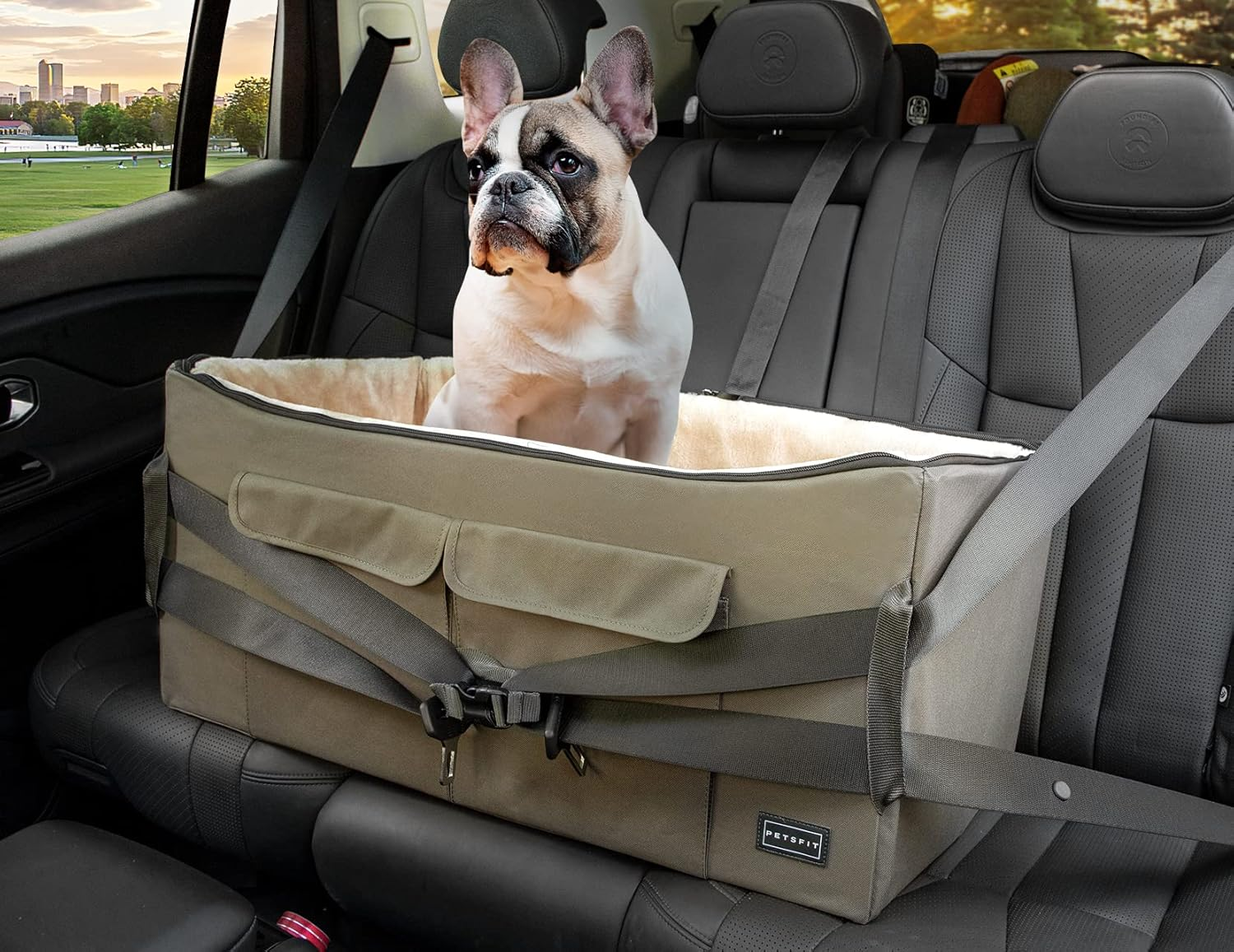 Dog Car Seat for Small/Medium Dogs under 35Lbs, Detachable & Washable Elevated Pet Travel Bed, 2 Storage Pockets & Safety Belt, Anti-Slip Base, Dog Booster Car Seat with Seamless Bottom Design