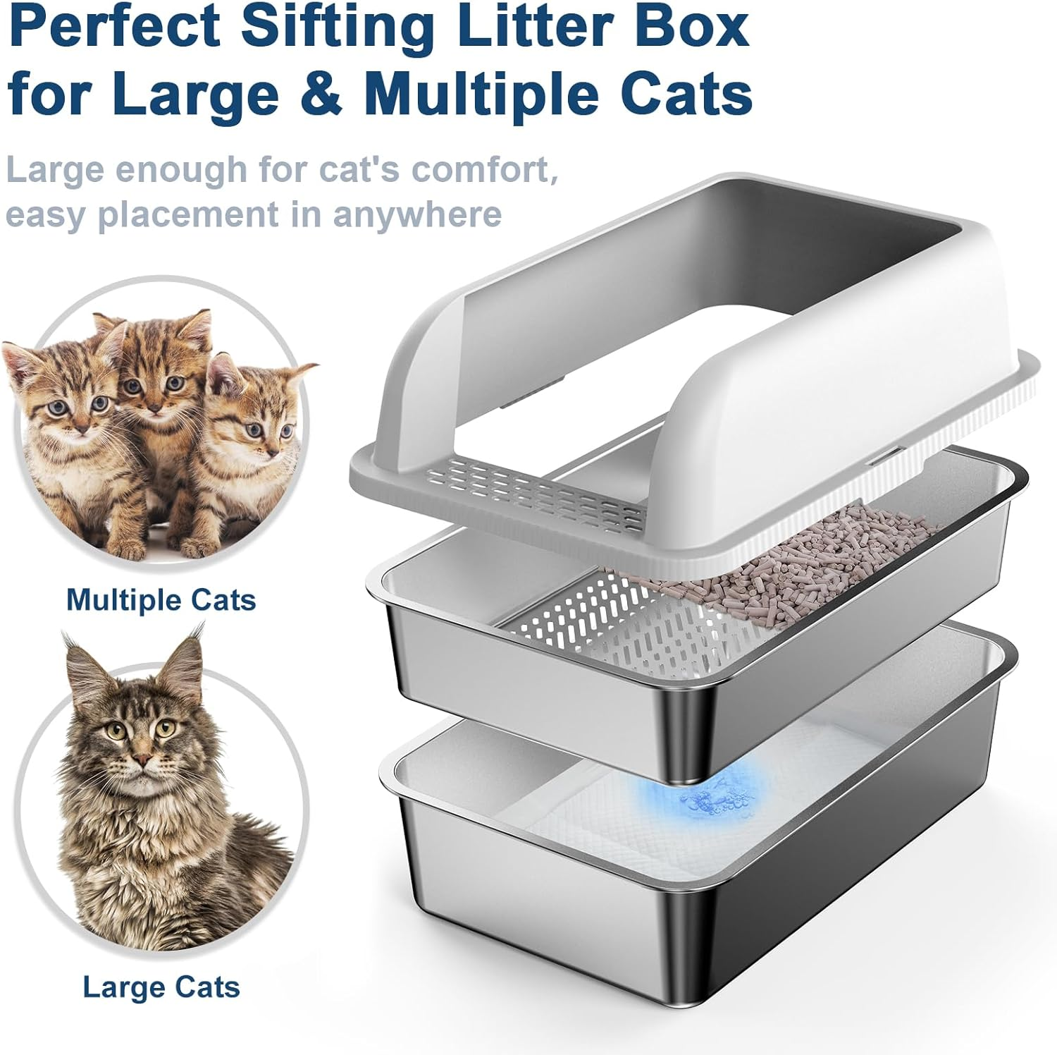 • Sifting Cat Litter Box for Dual Odor Control: Compared to the plastic litter boxes, this stainless steel cat litter box with lid is sturdy and non-sticky, leaving no lingering odors behind. The sifting pan design with special elliptic holes does not stuck the non-clumping cat litter and helps filter urine quickly, while the bottom pan is covered with a super absorbent pee pad, keeping the large metal cat litter box clean and tidy, providing double protection for odor control
