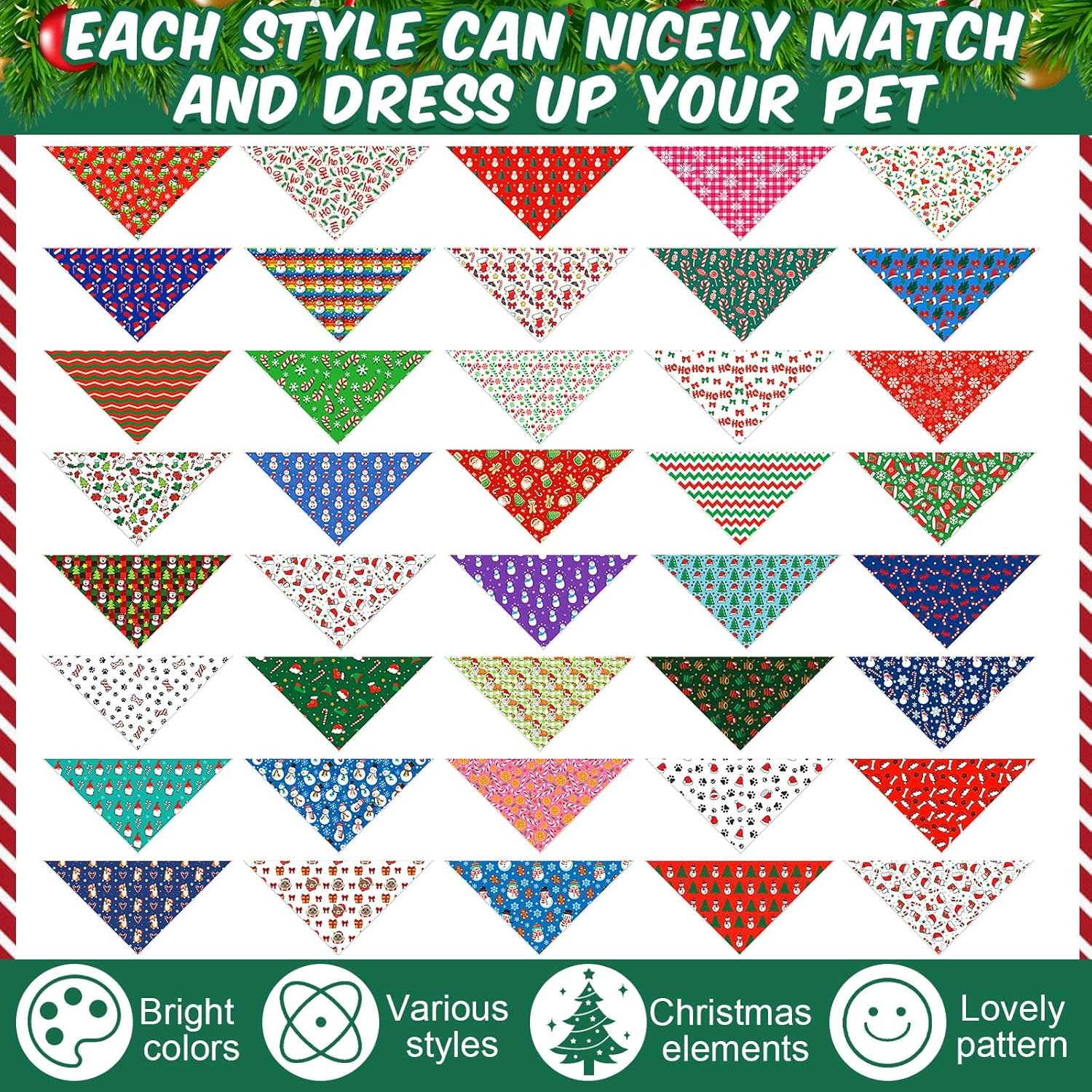 - Festive Christmas Designs: embrace the holiday cheer with these Christmas Dog Bandanas, featuring 40 unique patterns like candy canes, Santa, Xmas hat, snowflakes, Christmas trees, snowman; With classic red, green, and white tones, your furry friend will be the star of any holiday gathering
