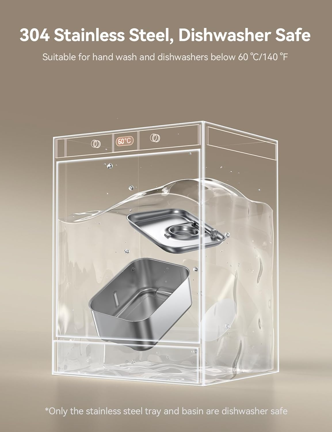 - 304 Stainless Steel Material: Crafted from 304 stainless steel, the water tank and tray are safer and more durable than plastic. This material ensures clean, healthy pet water and helps prevent feline acne. Plus, it’s suitable for dishwashers below 60 ℃/140 ℉. Note: Only the stainless steel water tank and water tray are dishwasher safe