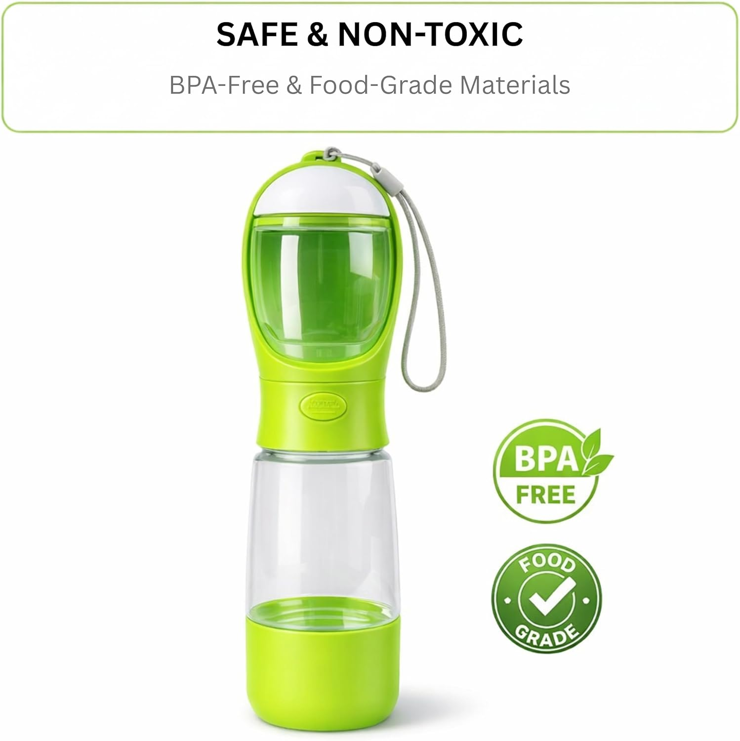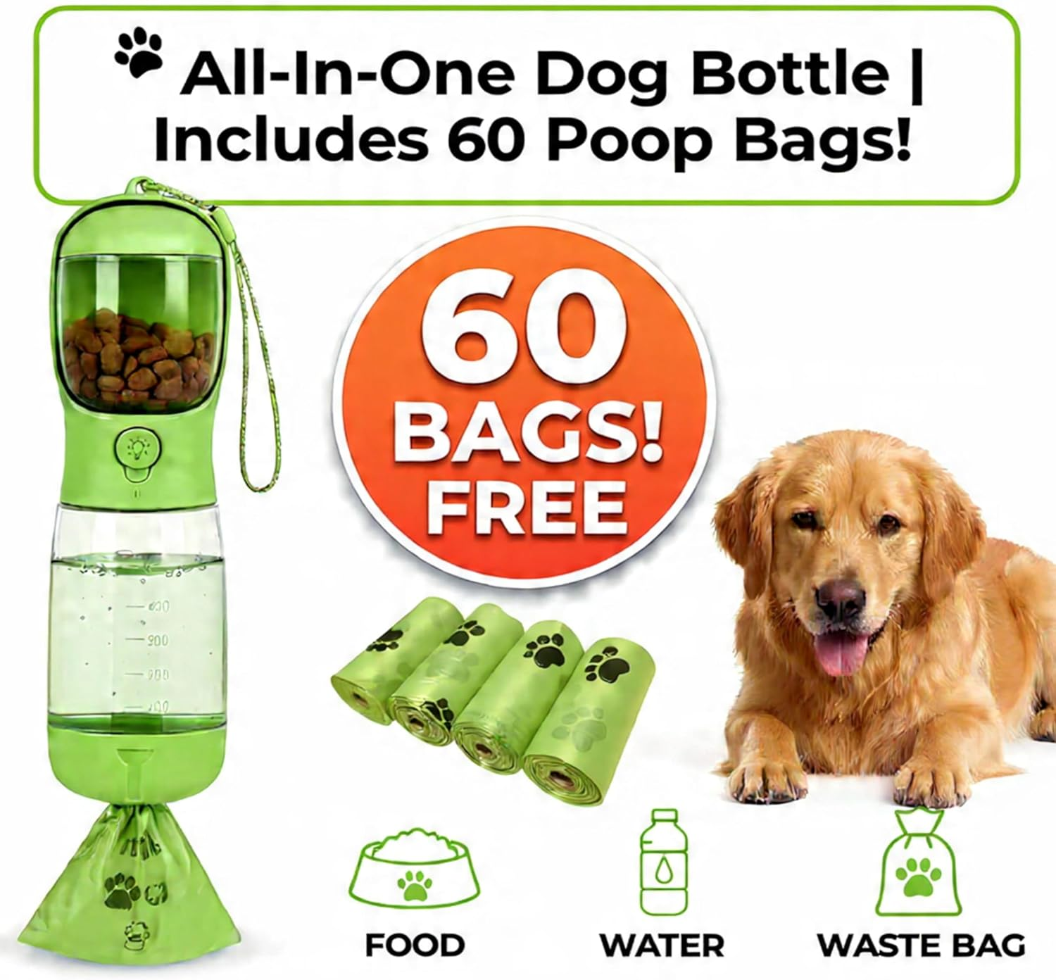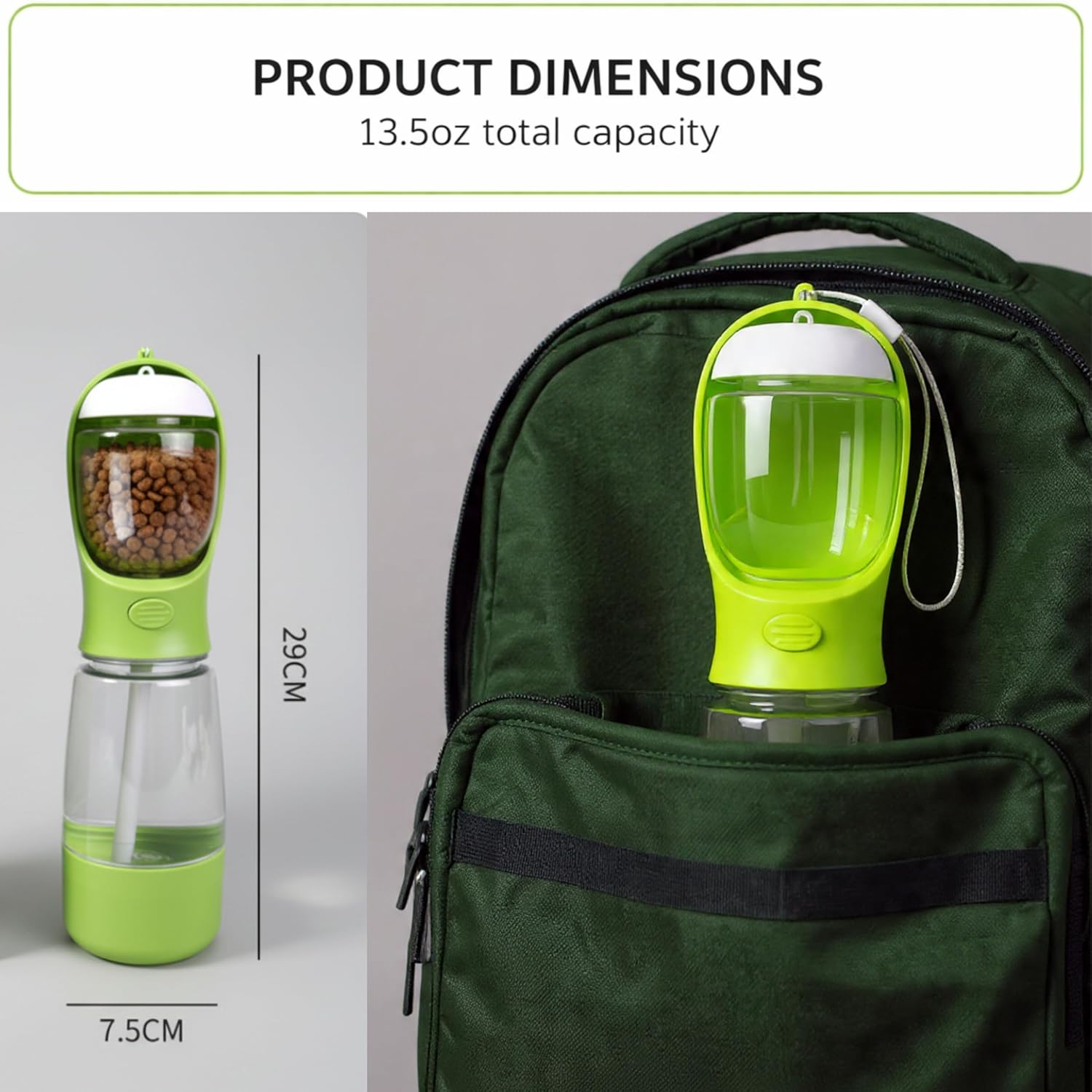 PERFECT 3-IN-1 TRAVEL SOLUTION FOR DOGS & CATS Are you tired of carrying multiple items when traveling with your furry friend? Our innovative 3-in-1 portable pet water bottle is the ultimate solution for dog and cat owners who love adventure! WHAT’S INCLUDED: Leak-proof water dispenser (400ml/13.5oz capacity) Built-in food container for treats or kibble (150ml) Integrated poop bag holder with 60 biodegradable waste bags Durable metal carabiner clip for easy attachment PREMIUM QUALITY & SAFETY: Made from BPA-free, food-grade materials that are completely safe for both dogs and cats. The upgraded silicone seal ring and one-button lock system guarantee zero leaks in your bag, car, or backpack. Wide water trough design accommodates pets of all sizes. ULTRA PORTABLE & CONVENIENT: Weighs only 7oz and fits easily in any backpack, purse, or car cup holder. The built-in carabiner attaches securely to backpacks, leashes, belt loops, or cat carriers for hands-free carrying. One-hand operation makes hydration quick and easy during walks, hikes, or travel. PERFECT FOR: ✓ Dog walking & cat travel ✓ Hiking, camping & outdoor adventures ✓ Beach days & park visits ✓ Road trips & vet appointments ✓ Training sessions & jogging ✓ Any outdoor activity with your pet ECO-FRIENDLY DESIGN: Includes 60 biodegradable waste bags that are gentle on the environment. The integrated dispenser fits standard-size bags for easy refills. Available in attractive green color. SATISFACTION GUARANTEED: We stand behind our product with responsive customer service. Join thousands of happy pet parents who trust our 3-in-1 solution for their dogs and cats! ORDER NOW and make every adventure with your furry companion easier and more enjoyable – whether they bark or meow!