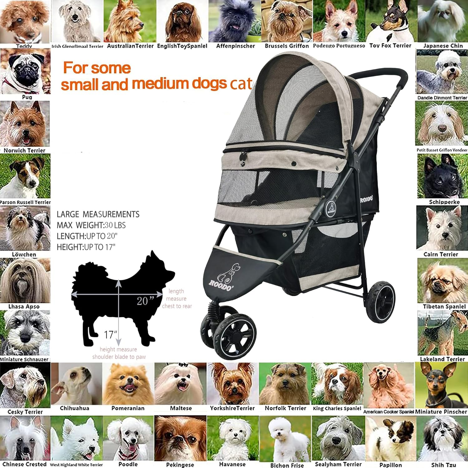 - ROODO multifunctional three-wheeled pet stroller is smooth and easy to use. The pet rest area is covered with multi-directional breathable nets to enjoy the fresh air and protect your pets from insects. Equipped with a storage basket for easy storage of items. The pet stroller can be folded easily and compactly enough to fit into the trunk of the car. It is a great choice for walking, jogging, and traveling. Bring your pet to enjoy outdoor activities with you.