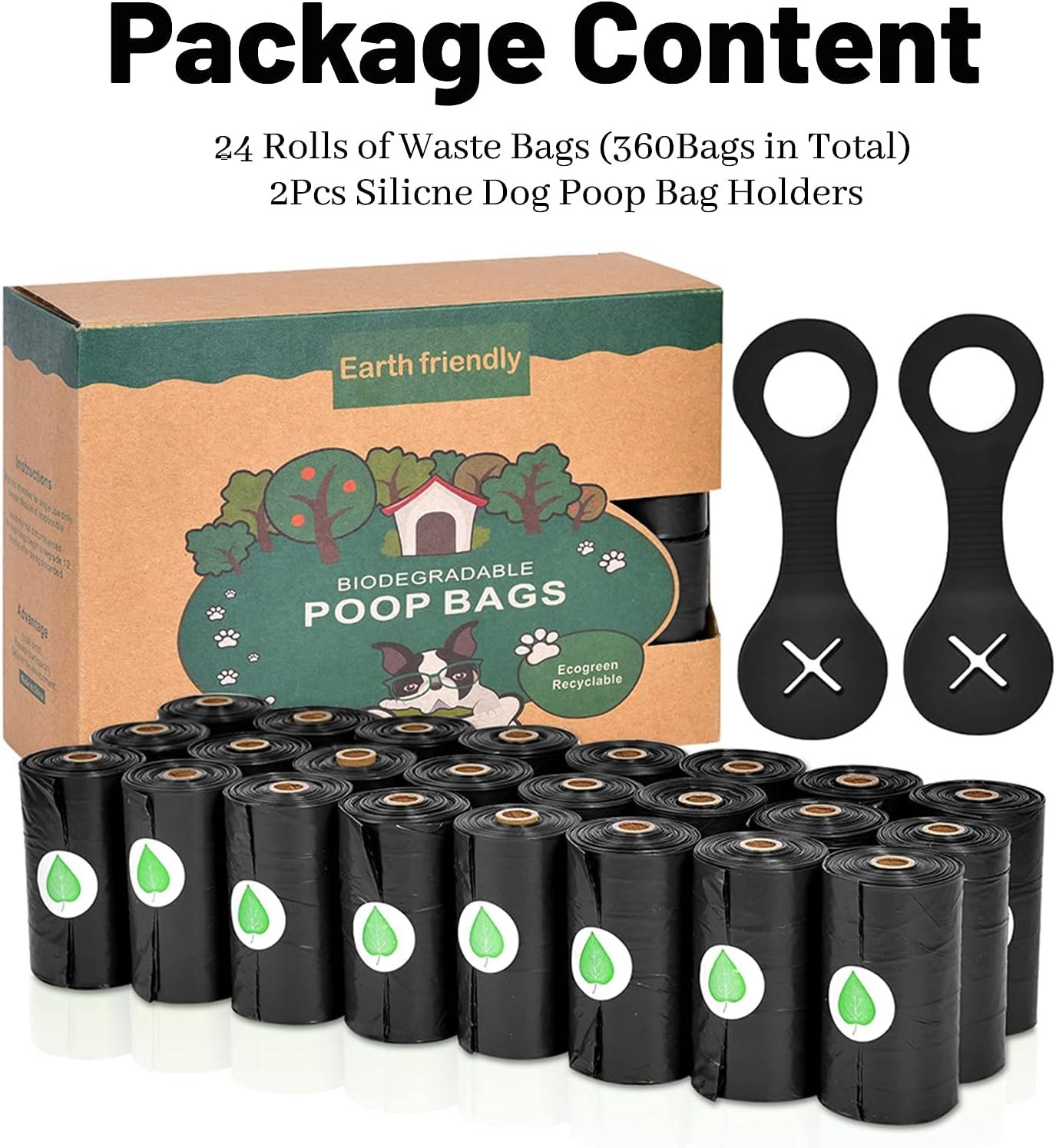 Package Include: 360 Dog Poop Bags(24Rolls) & 2PCS Silicone Dog