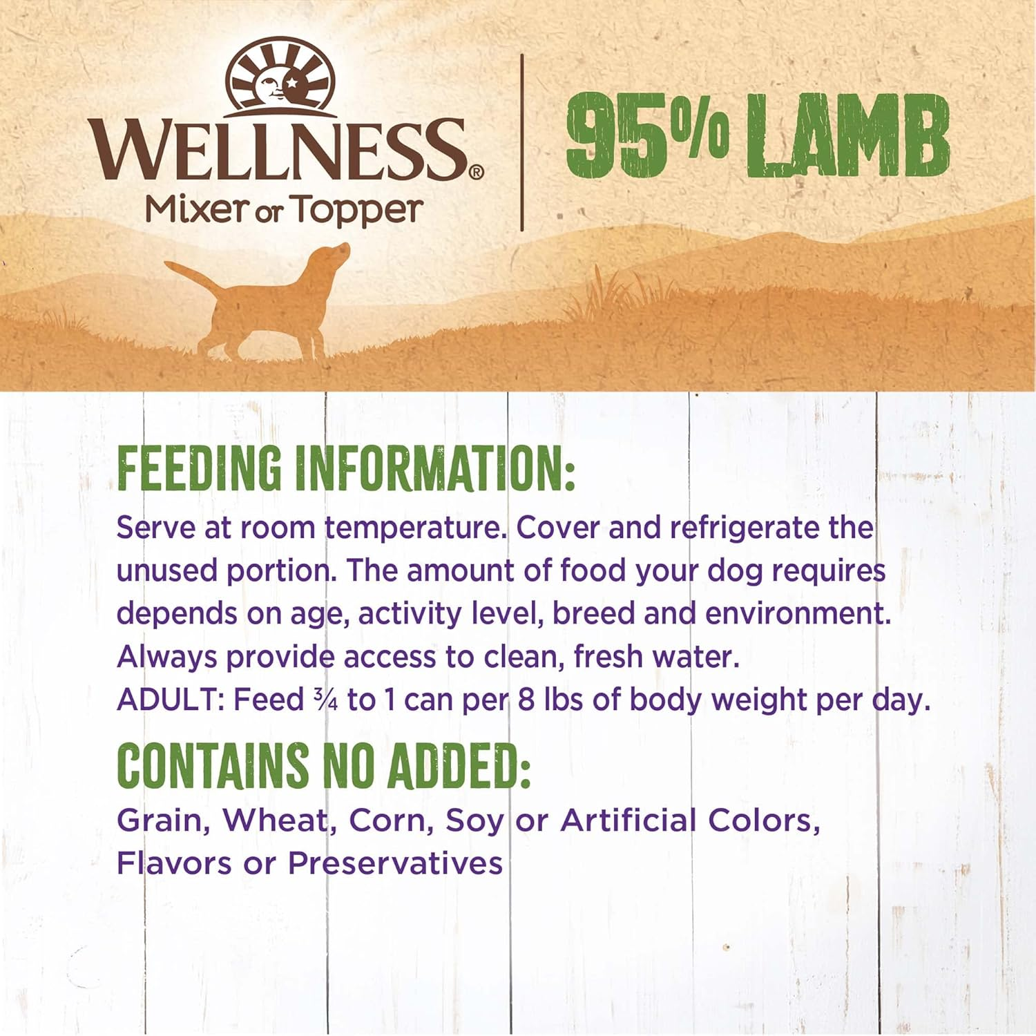 - GRAIN-FREE WET DOG FOOD: Each can of Wellness Ninety-Five Percent Lamb Pate is packed with all-natural, grain-free lamb and not much else. Serve as a delicious mixer or topper with a complete and balanced diet.
