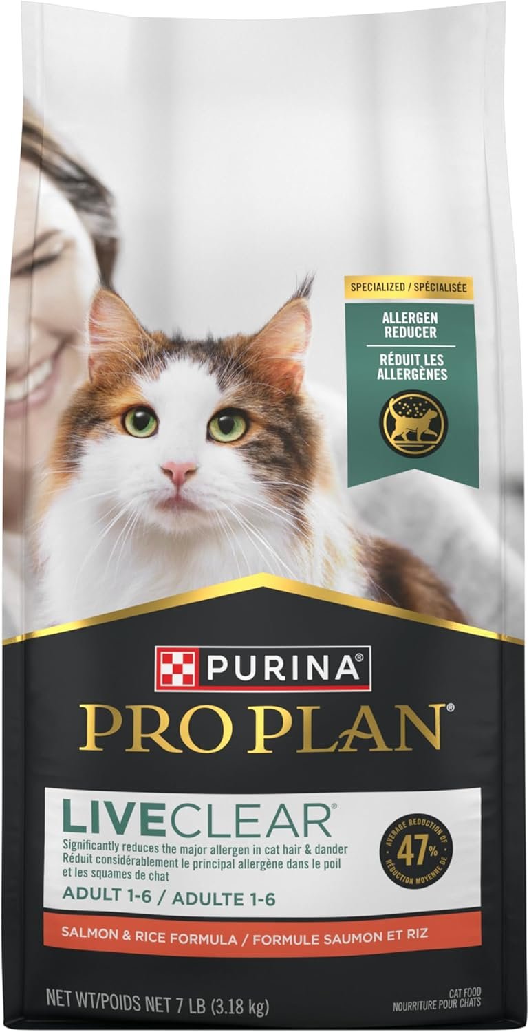 - Discovered through over a decade of research, Pro Plan LIVECLEAR cat food significantly reduces the major allergen in cat hair and dander by an average of 47 percent starting in the third week of feeding