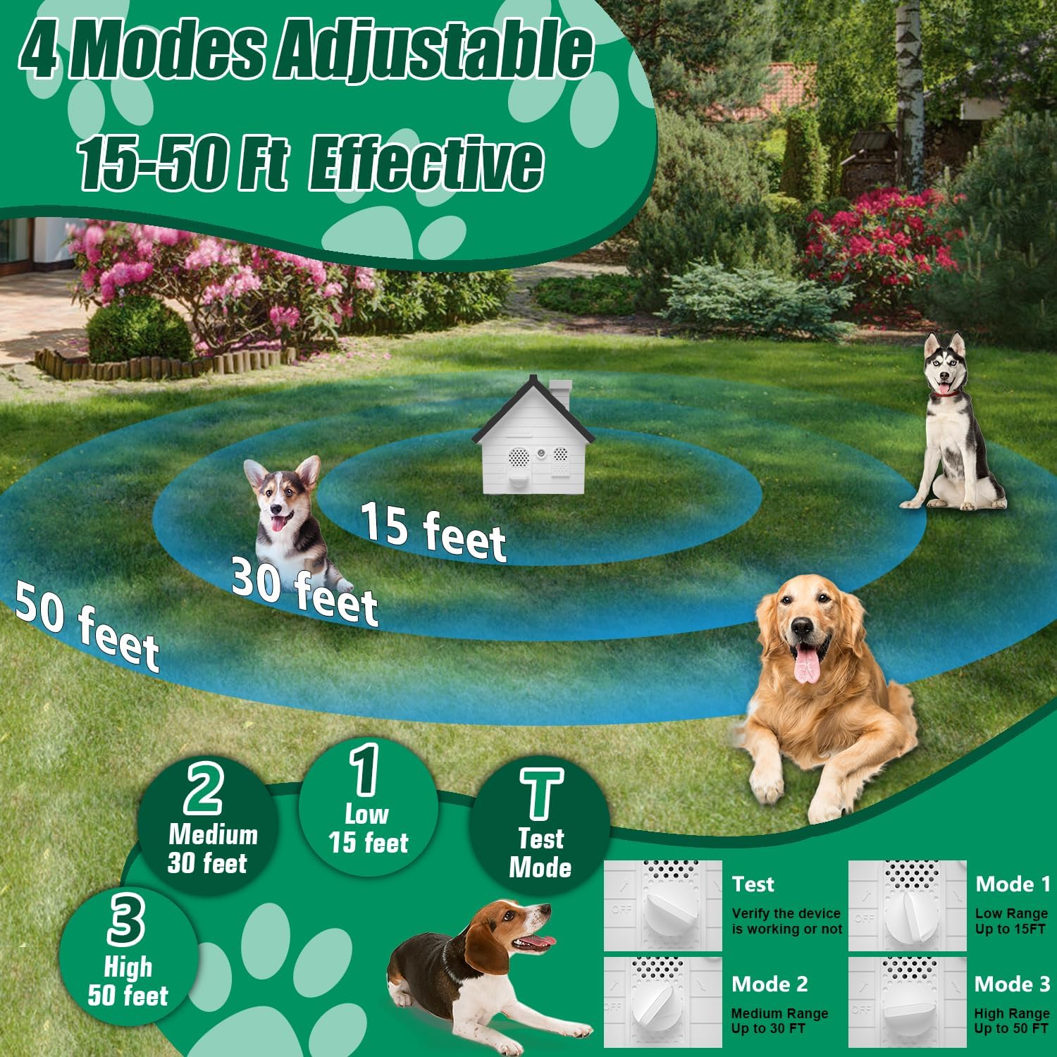 - 4 Modes Adjustable – Our anti barking device for dogs have 4 levels of ultrasonic modes(test, low-15KHz, medium-20KHz, high-30KHz), the anti dog barking device can auto-detect barking within 15, 30 and 50 feet, which can effectively stop dog barking indoors and outdoors, please turn the knob to test different frequency and choose the mode that works for your dogs, ultrasonic will not affect the hearing of people and dogs, you could use it without worry!
