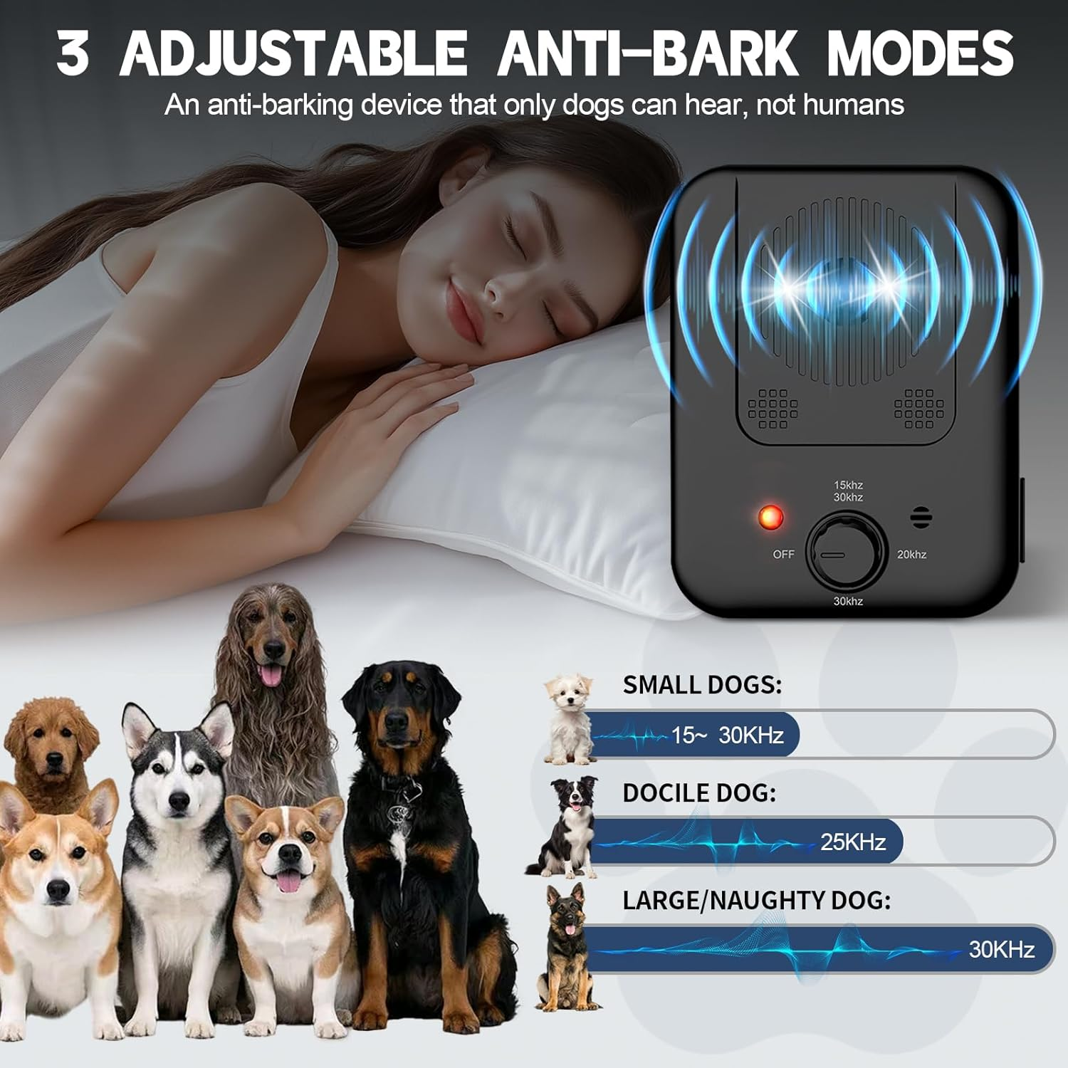 - Suitable For All Dogs: This anti-barking device is specially designed for dogs, fully covering the common hearing frequency range of all dogs. Relying on the latest Ultrasonic Anti-Barking technology, the device has 3 built-in ultrasonic frequencies tailored specifically for dogs, which cycle between the three frequency bands during operation. Avoid letting dogs get used to a single ultrasonic frequency – it will be less effective at stopping barking.