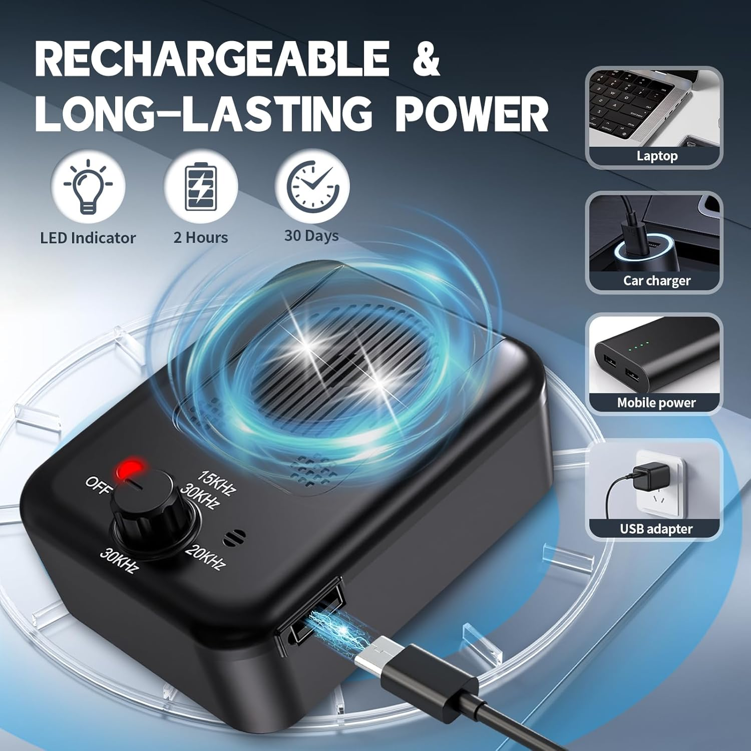- Easy to Use: This anti-barking device is ready to use right out of the box. You can place it directly on a table or other flat surface. Alternatively, using the mounting holes on the back of the product, you can easily mount it on a wall or even a tree. It is rechargeable and can work continuously for 30 days after a full charge, providing you with worry-free barking control.
