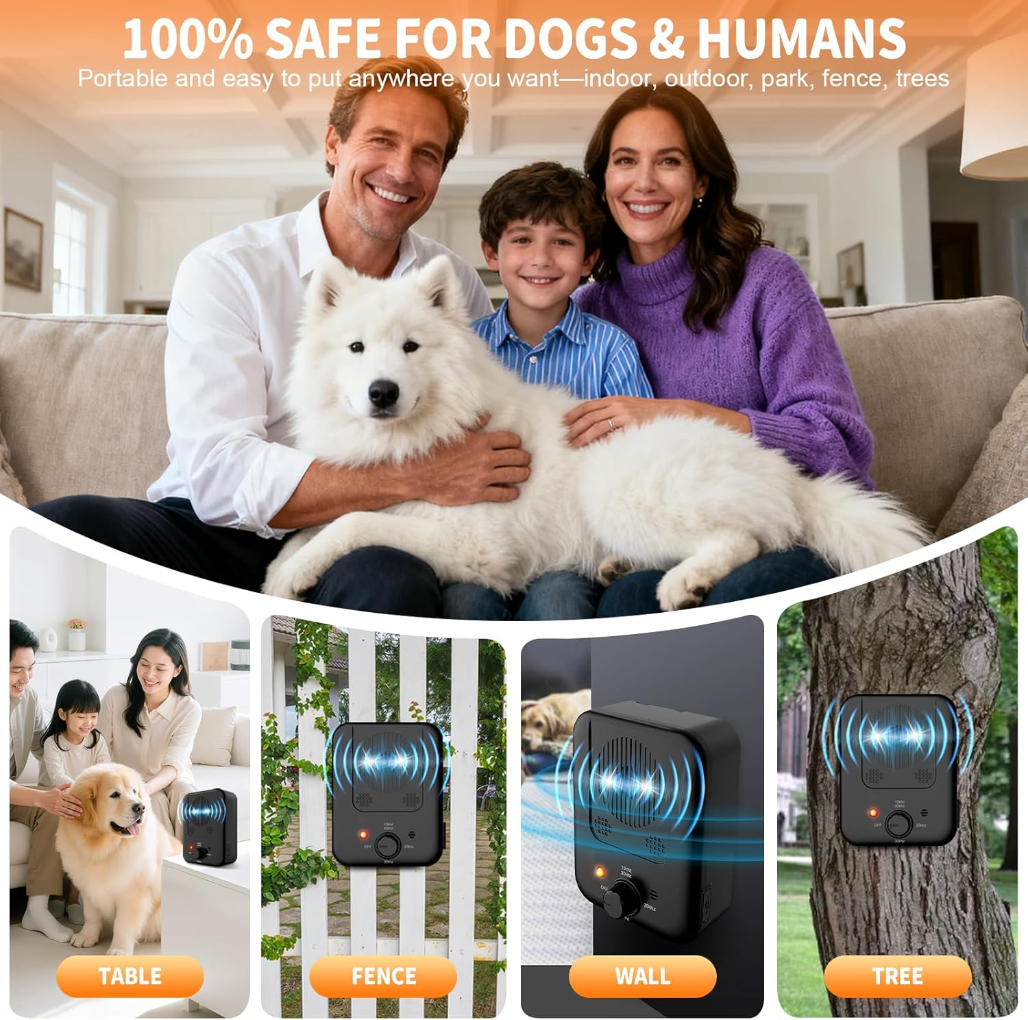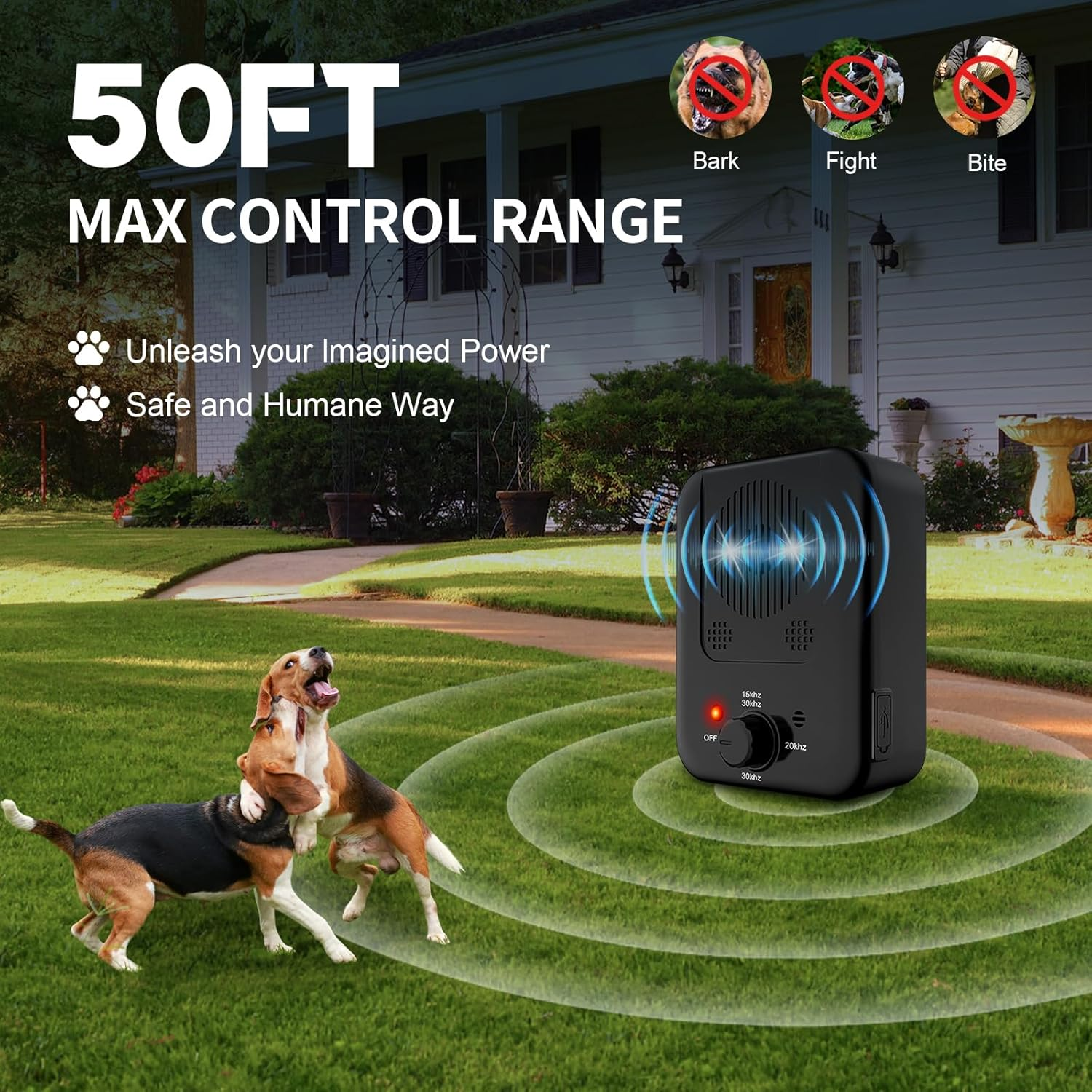- Automatic Anti Bark Device:This intelligent ultrasonic dog bark deterrent can automatically sense the barking sound of dogs and emit ultrasonic waves in real time, effectively stopping the barking of pet dogs, neighbor dogs,and outdoor stray dogs. The bark box suitable for indoor, outdoor. It adopts the latest upgraded IPX4 Waterproof ultrasonic technology in 2025, ultrasonic dog bark stopper to detect dog barking is 33ft, the shock distance of ultrasonic waves is 50ft, and the ultrasonic wave bands are 15-30KHZ, 20KHZ, and 30KHZ respectively.