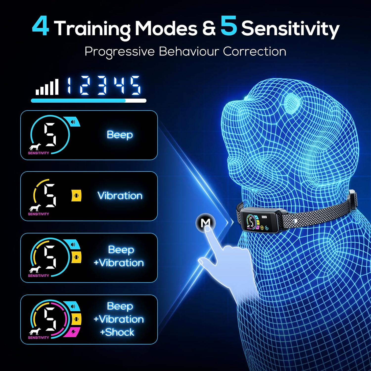 - 【4 Humane Training Modes】You can choose beep, vibration or a combination of both, and for more stubborn dogs, there is a shock mode. Designed for gradual learning, the system starts with a gentle reminder and escalates only when needed, without causing stress or injury. 5 levels of adjustable sensitivity for a variety of environments.