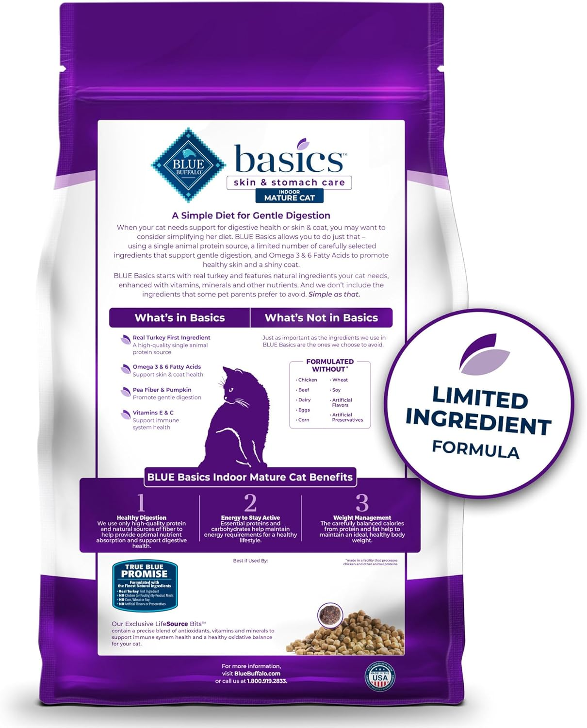 - Contains: One (1) 11-lb bag of BLUE Basics Mature Grain-Free Dry Cat Food For Skin & Stomach Care, Turkey & Potato Recipe