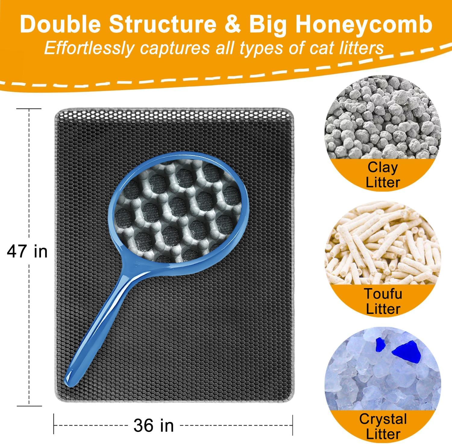 - Cat litter rug mat is crafted with a unique 2-layer and big honeycomb design, ensuring that scattered litter is caught in the mat’s honeycomb texture, making cleanup a breeze