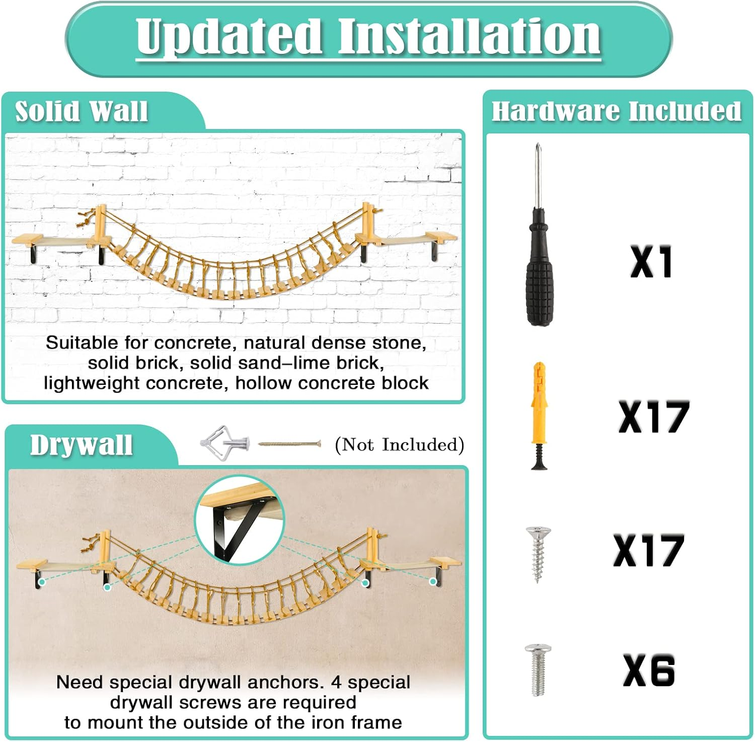 • HAND-CRAFTED AND STURDY – Each plank is cut and polished by hand, and the planks are connected by two jute ropes. Finally, the cat stand and the hanging climbing bridge are assembled together, which is very strong and safe. And is compatible with your cat tree, cat apartment, cat habitat, and cat litter box enclosure furniture.