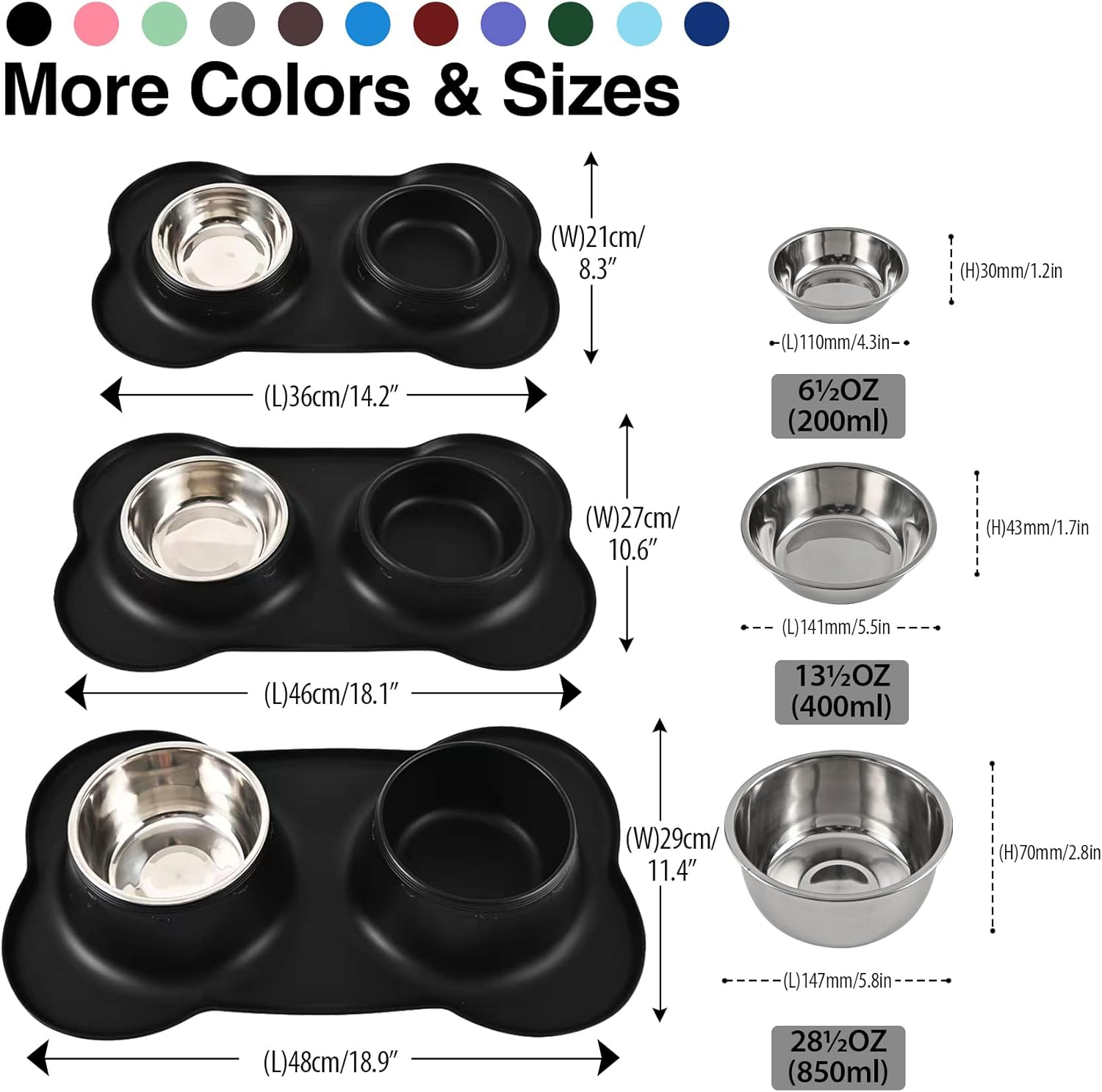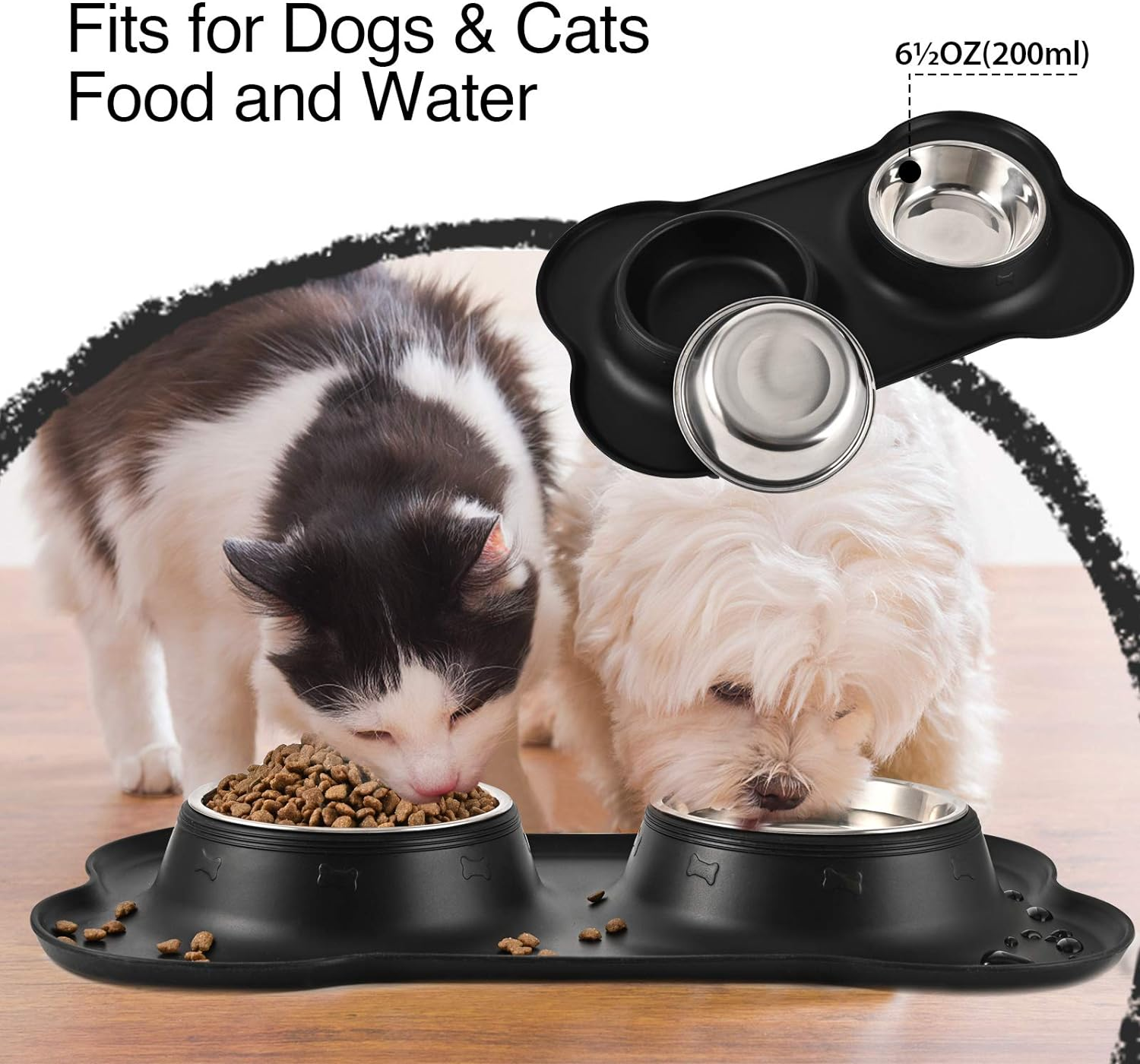 - PET BOWL SPECIFICATION: our dog bowl set includes 2 stainless 6½ fl oz(200ML) each bowls (4.5″ Dia x 1.3″ H) and one mat of 14.2″ x 8.3″ x 1.4″ to feed food and water for extra small, toy breed cat dog or small animal