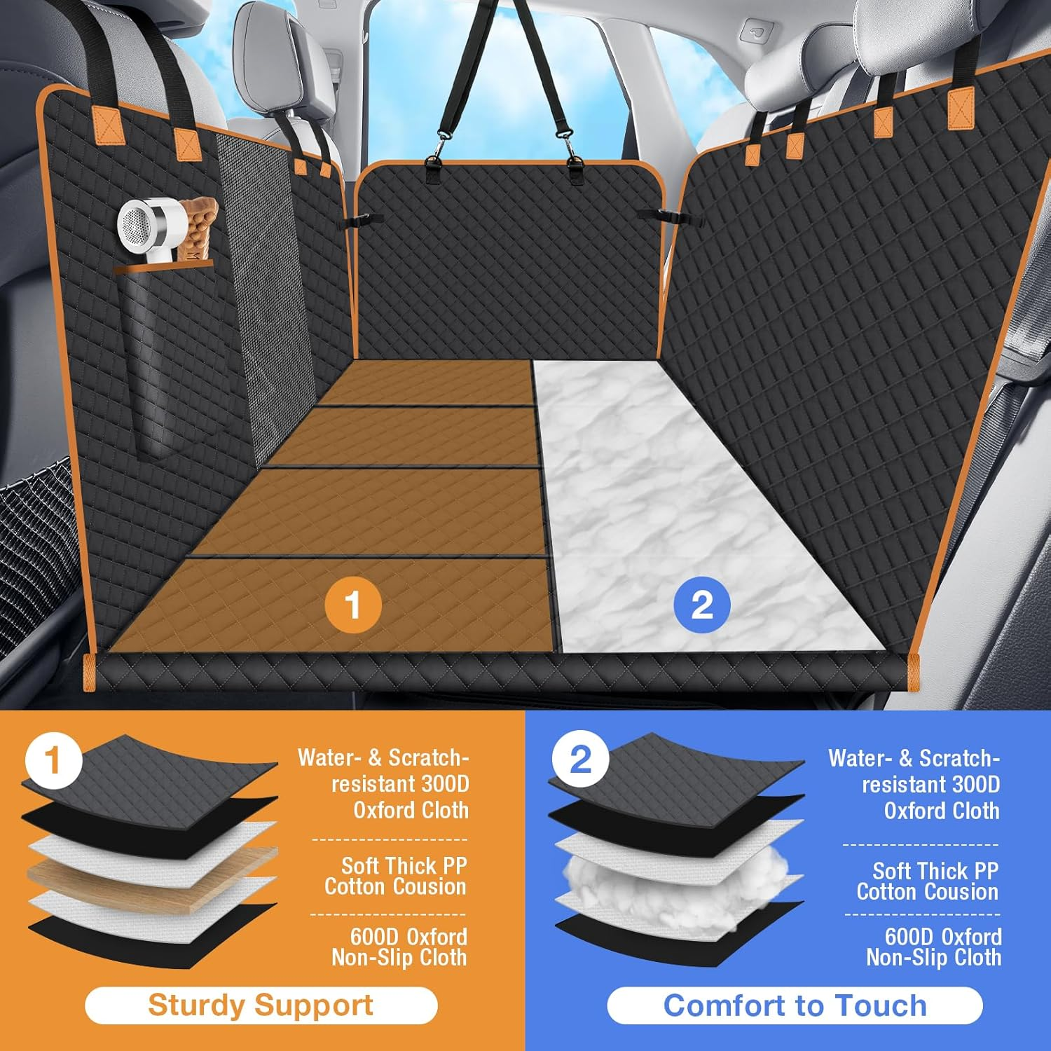 • 【No More Pets Falling】The back seat cover for dog features sturdy bottom board, which is strong enough to support your dog with dog safety seat belt to prevent your pet from sliding during drive.