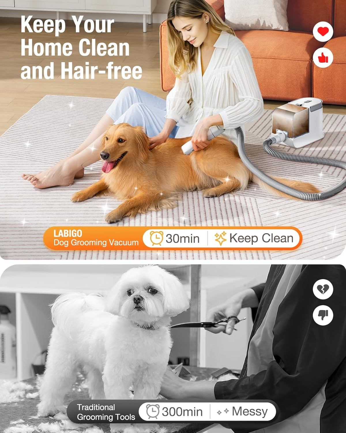 - Grooming and Vacuuming All at Once: LABIGO dog groomer kit with vacuum function, easily collects 99% of pet hair into the vacuum container when grooming pet hair. With this all-in-one tool, you don't have to worry about hair being scattered all over your home. Just say goodbye to hair-covered furniture and hello to a neat, hair-free home. Even if you are a novice, you can easily complete home grooming