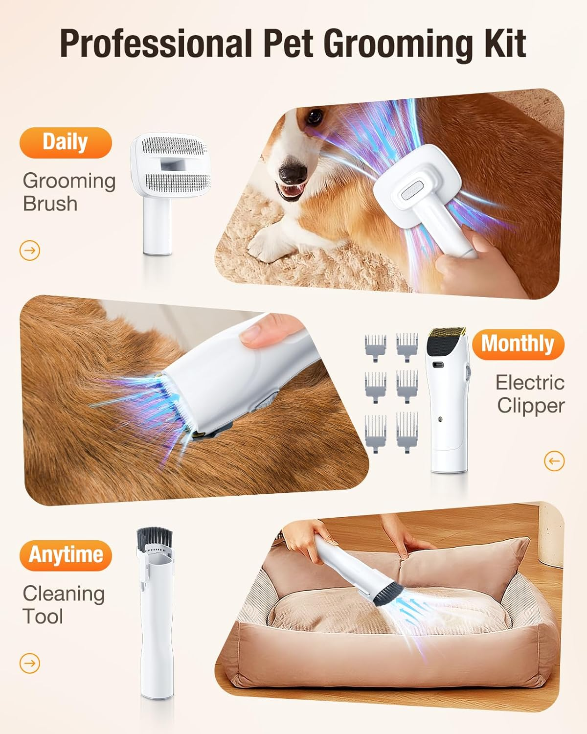 - Warm Tips: We recommend calming your pet with snacks or toys before using; starting with the lowest suction level to make it easier for your pet to get used to it; and combing your pet's hair with our grooming brush before trimming it. These will make the pet grooming experience more enjoyable.