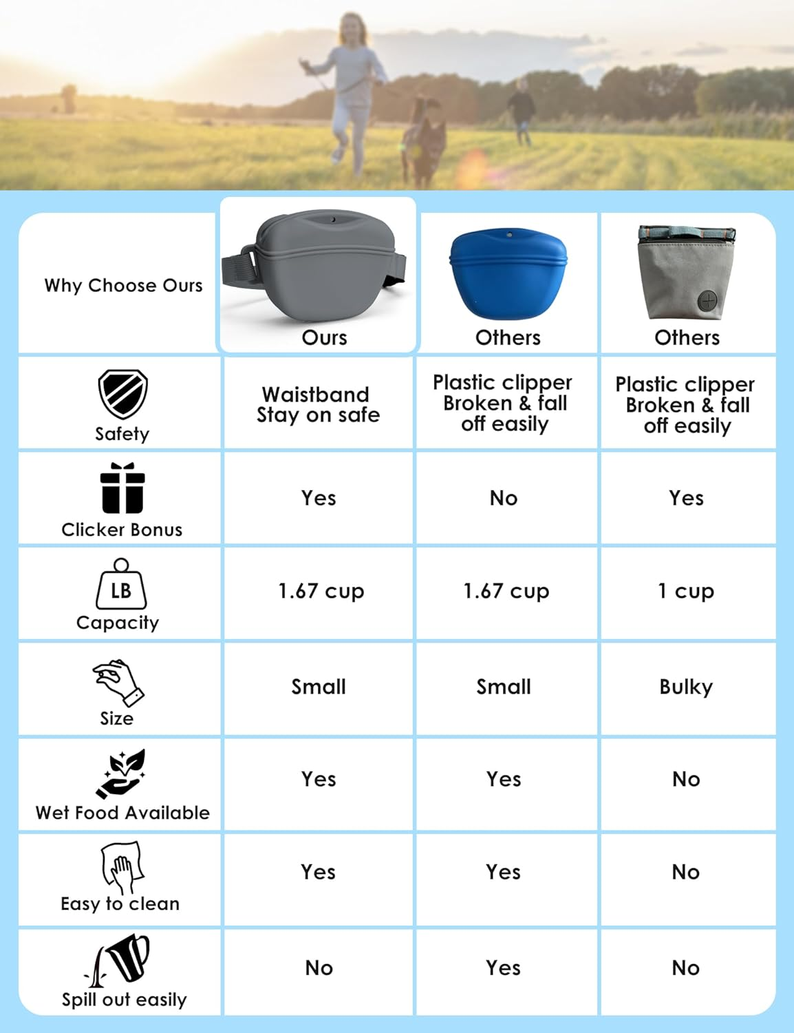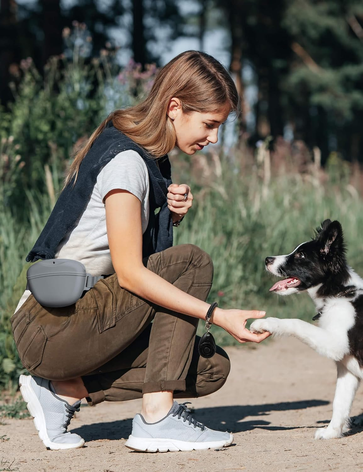 - 【Unique Waist Belt Design】Unlike other silicone dog training pouches, we have taken extensive time and effort to address the risks of plastic clips breaking or failing to securely fasten. After careful consideration, we are proud to present our latest product that eliminates the worry of your pouch accidentally detaching during training sessions or walks. The waist belt is adjustable and suitable for waist sizes ranging from 28 to 45 inches, ensuring a comfortable fit for users. Now, you can confidently focus on your training or outdoor activities without the concern of your pouch slipping off.