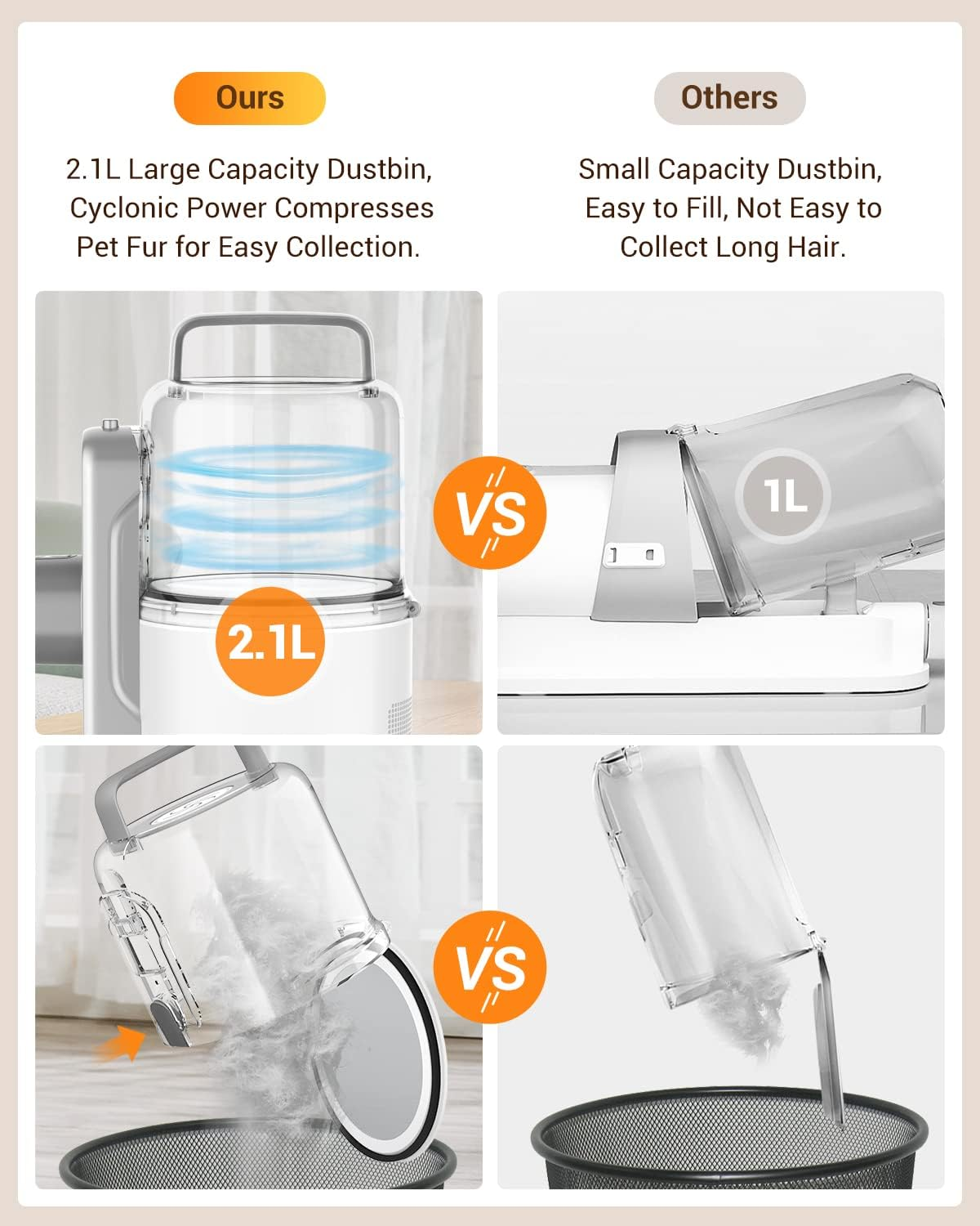 - Large Capacity for Less Frequent Emptying: With a generous capacity, our dog hair vacuum reduces the need for frequent emptying, allowing for longer, uninterrupted grooming sessions.