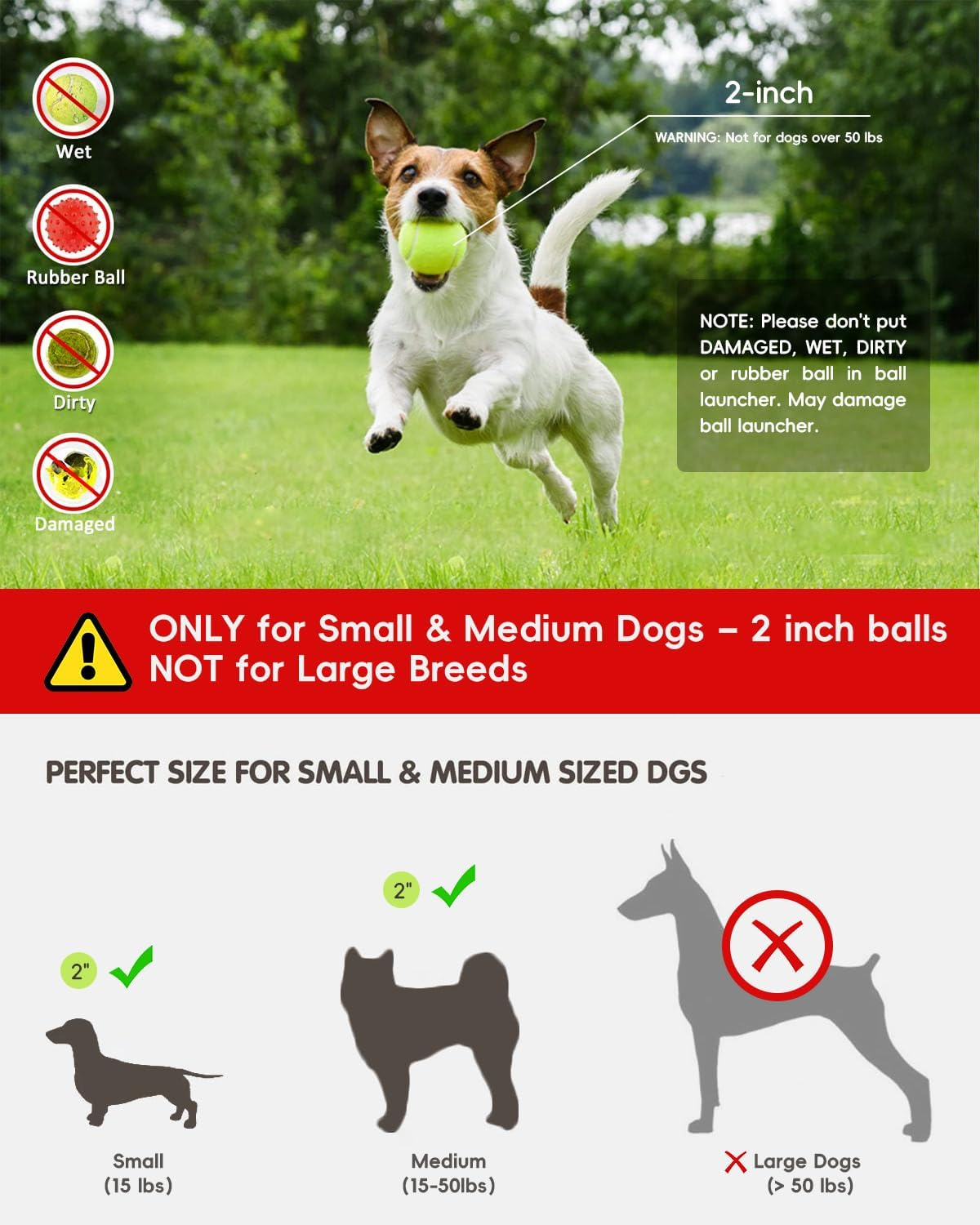 - PLEASE NOTE – This ball thrower for dogs is specifically designed for small to medium-sized dogs. The 2-inch balls are not suitable for large dogs or those with large jaws