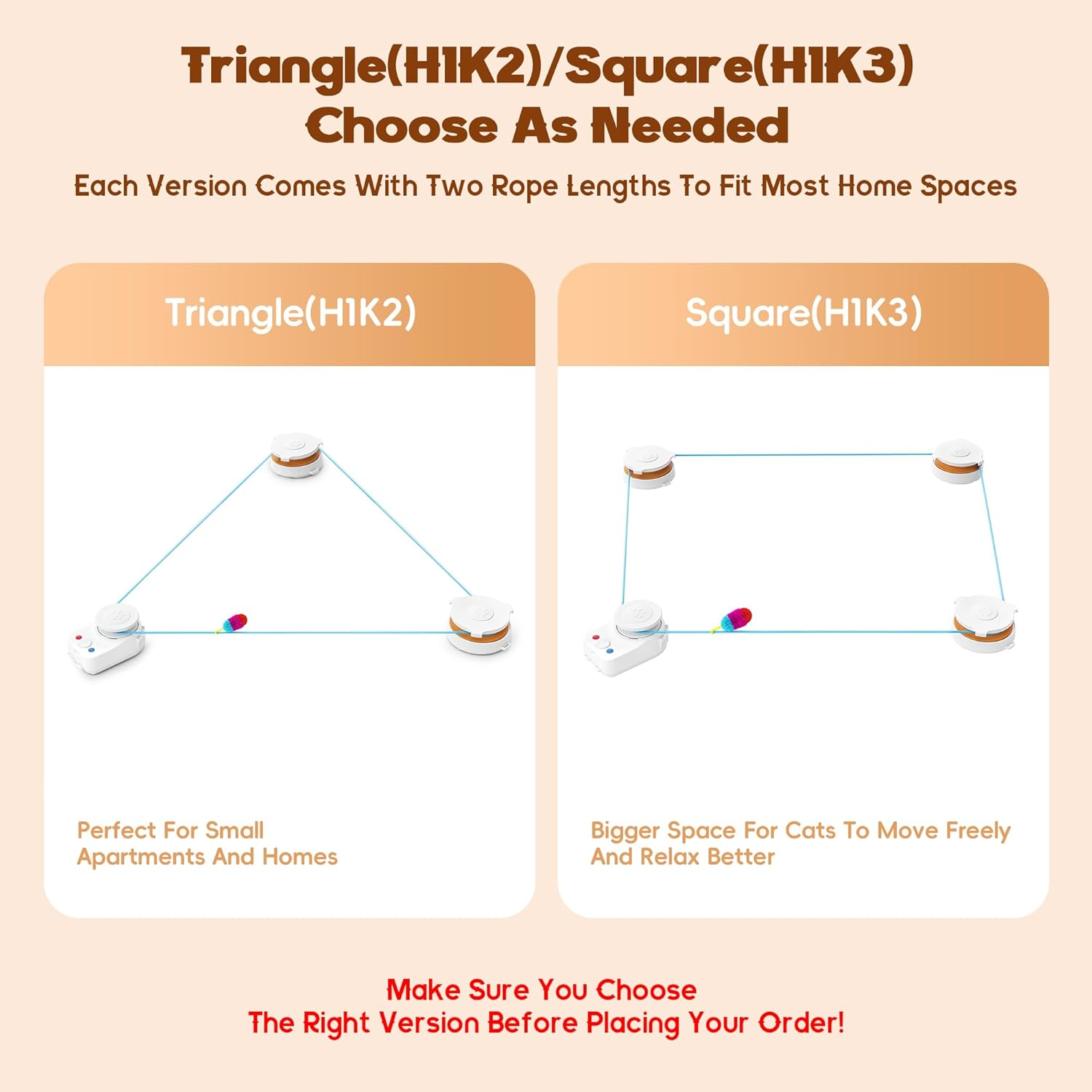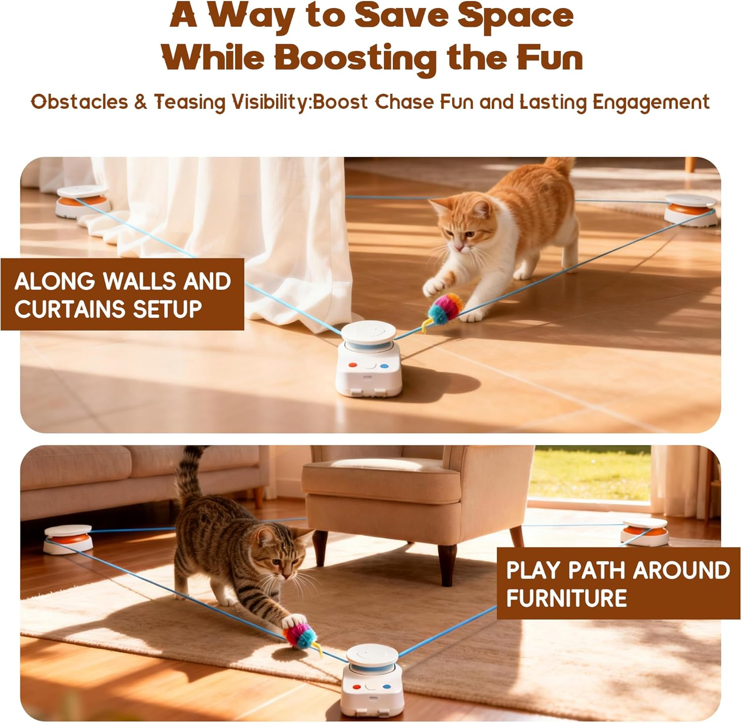 - 【DIY Play Paths】Place safe obstacles inside the rope’s circle to expand the play area. By adjusting the position of the main unit and sub-units, you can create different movement tracks to suit various indoor layouts. This unique setup increases challenge, improves agility, and adds more fun—turning the toy into a creative indoor cat treadmill alternative.