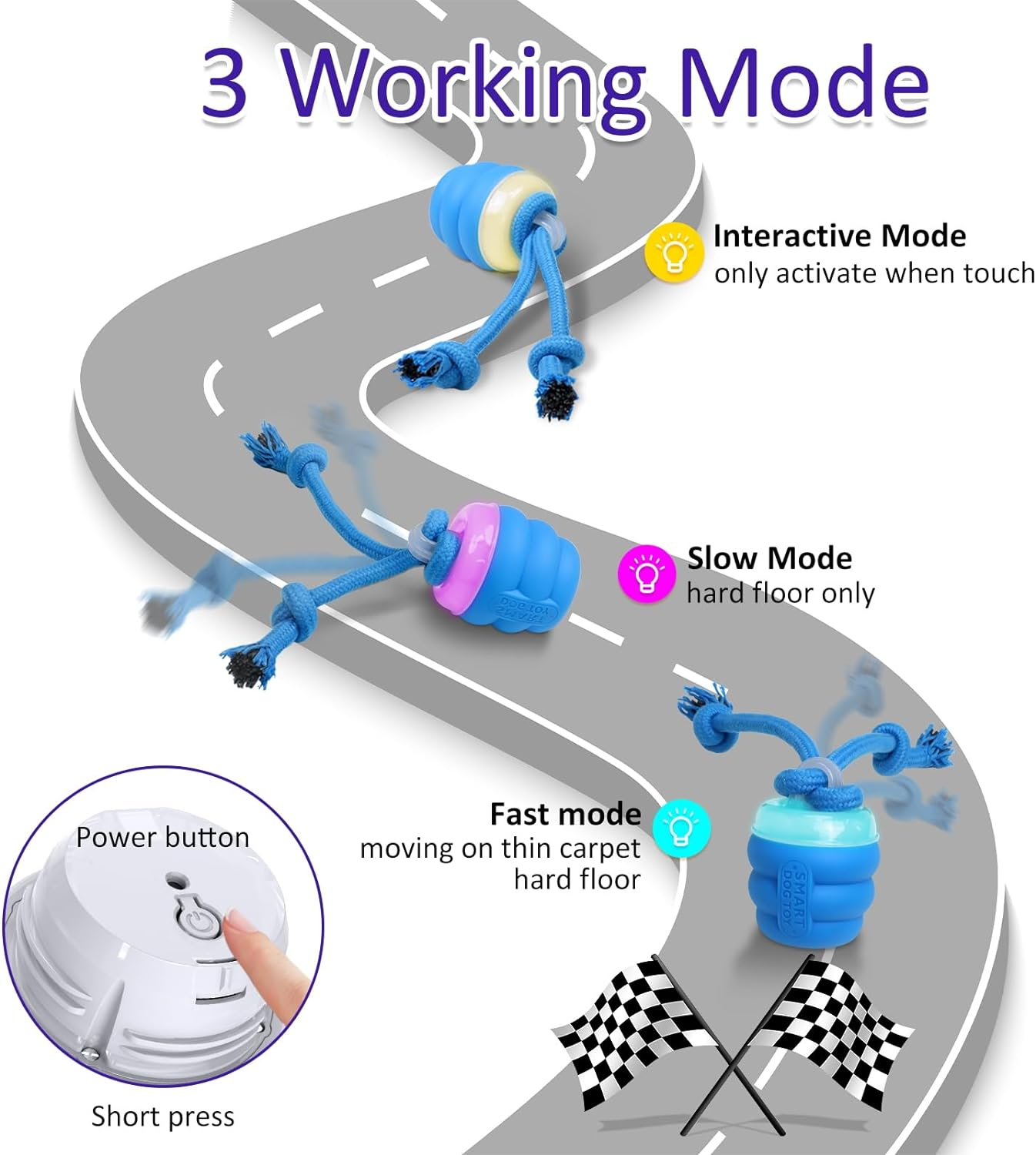 - How to use? Screw out the outer case to see the power button. Press first, power on and dog ball rolls in fast mode(blue light), change working mode by short press. Slow mode(purple light),Interactive mode(yellow light).Add the stronger rope on help balls rolls well, or you could DIY others special tails