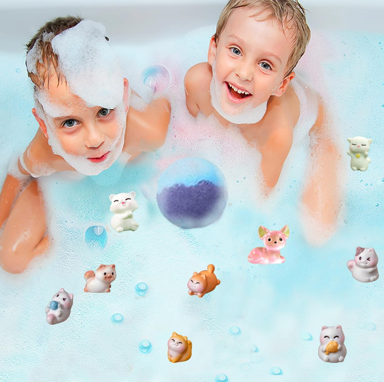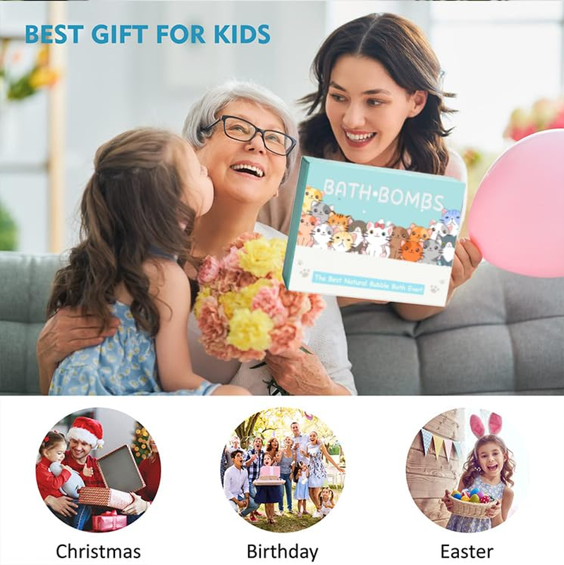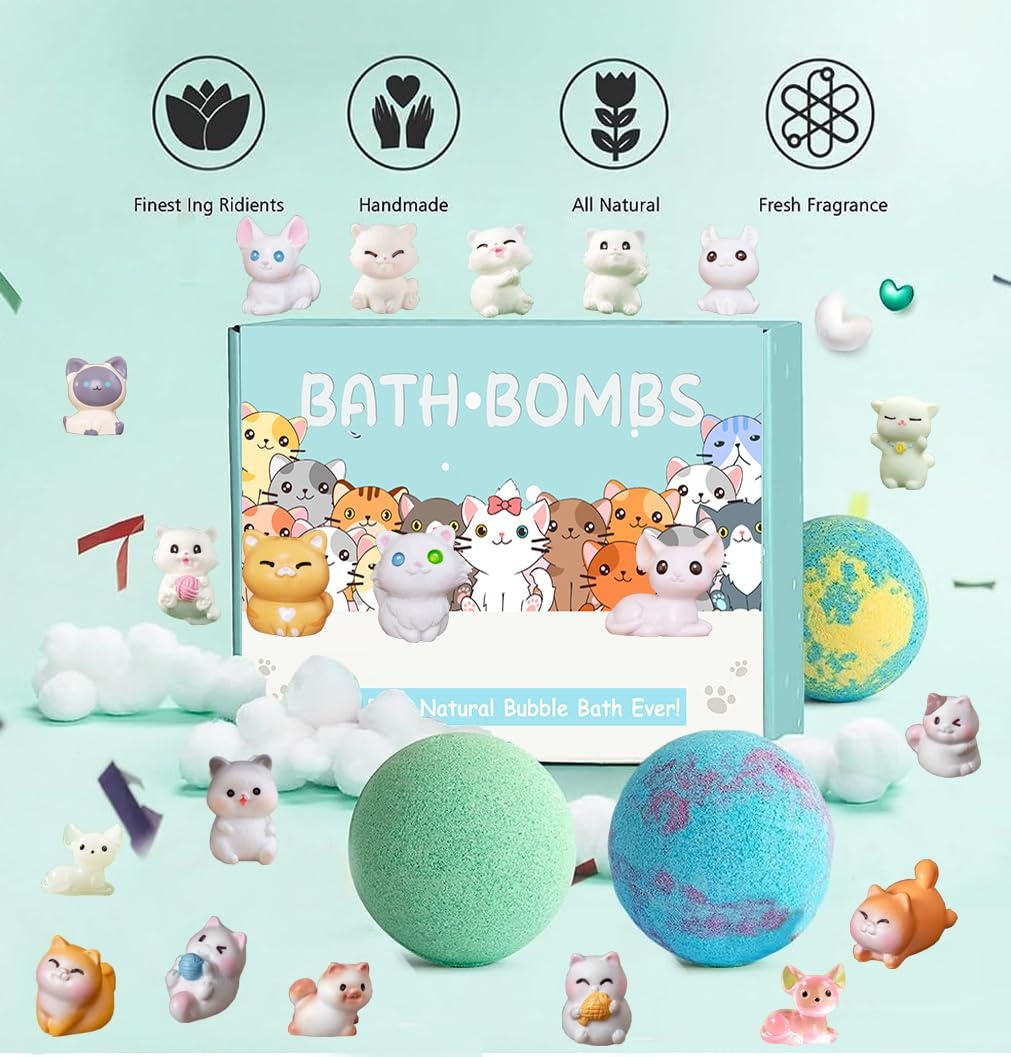 - 【20 Pack Bath Bombs with Surprises Inside】Each kids bath bomb has a different animal toy inside. Including 20 different kitten toys, 10 different scents, bringing different surprises to your child’s every bath.