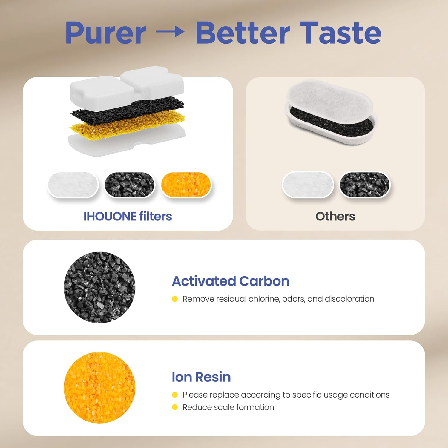 • Triple-Layer Filtration System: ① High-density cotton traps hair and debris, ② Ion-exchange resin softens water, ③ 30% thicker activated carbon eliminates odors. Multi-stage purification delivers fresh, great-tasting water cats love