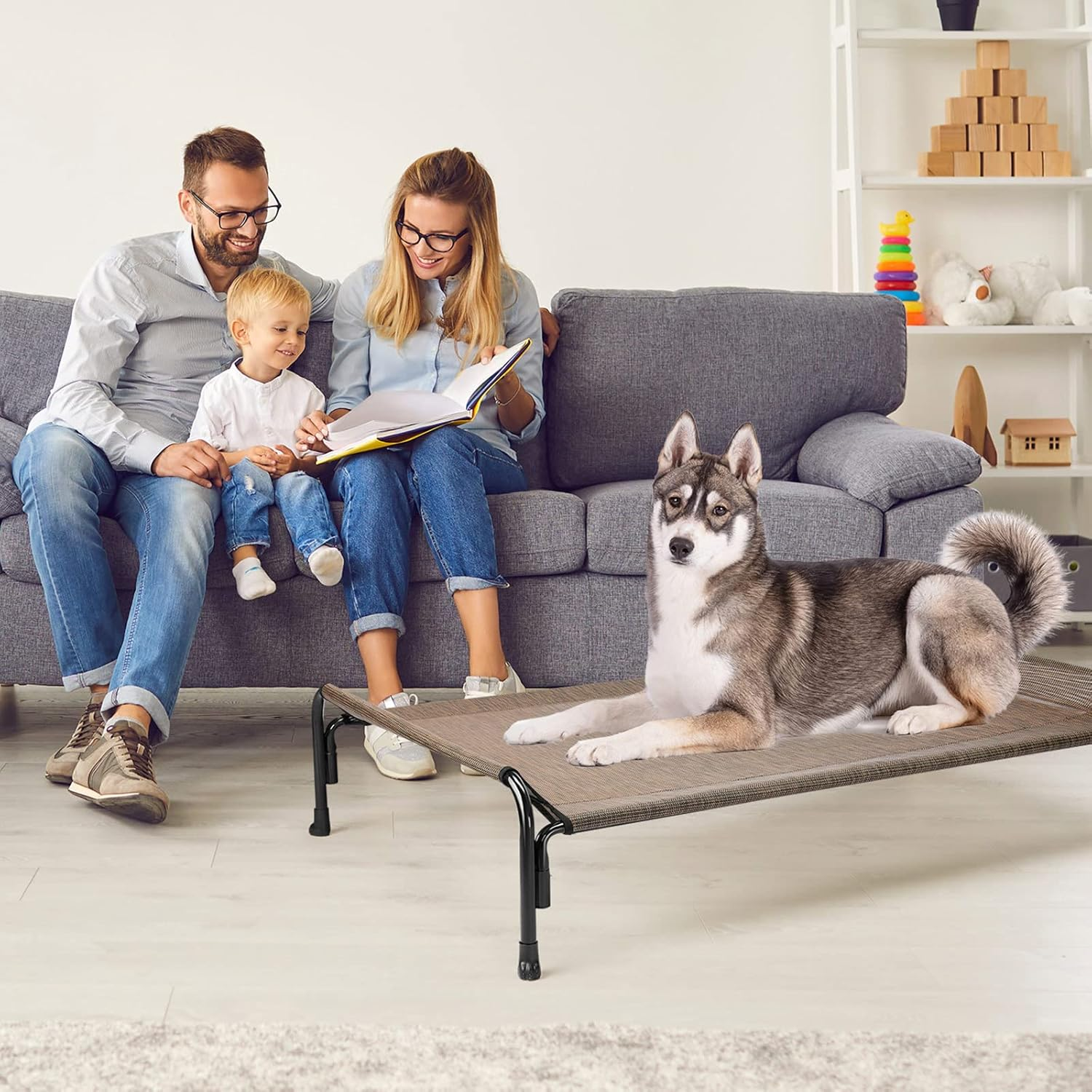 - Large Elevated Dog Bed. Composed of Powder-Coated Steel and Textilene Mesh. 43″L x 30″W x 10.6″H (111x77x27 cm), fits up to 90 lbs(40kg). Suitable for Golden Retriever, Labrador, Rottweilers, Boxers, Huskies, Border Collie, Samoyed, Wolf dog etc.