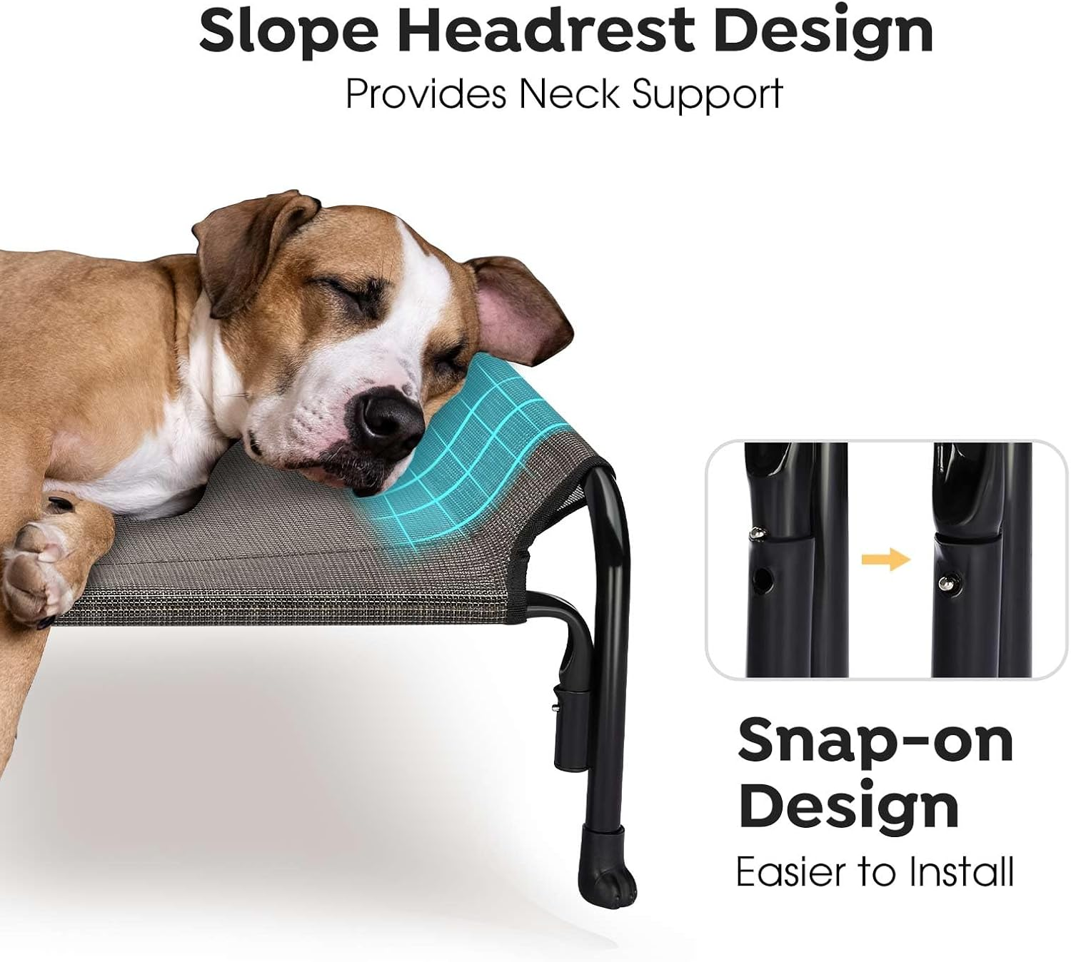 - Practical design for Better Life. The slope headrest provides support for your dogs while sleeping, and Protect neck health. Each support foot of the outdoor dog bed waterproof has a non-slip rubber pad, can not noly protect your floors from scratches, but keep the raised dog bed from sliding when your dog jumps on or off.