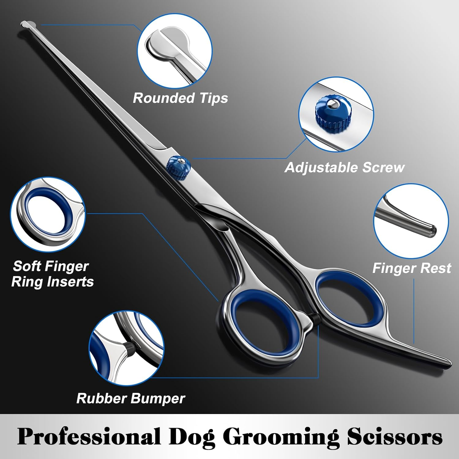 • 【Safe Design】All dog scissors are designed with Round Tips,so you don't have to worry about poking your pet's skin . A silencer between the handles reduces noise from stainless steel contact during trimming, preventing pets from becoming frightened and making grooming more enjoyable. Warm Note: The curved dog grooming scissors' blade design prioritizes efficiency (Quick Contouring), making them ideal for sensitive areas (face, neck, ears, abdomen, rear, paws, etc.)