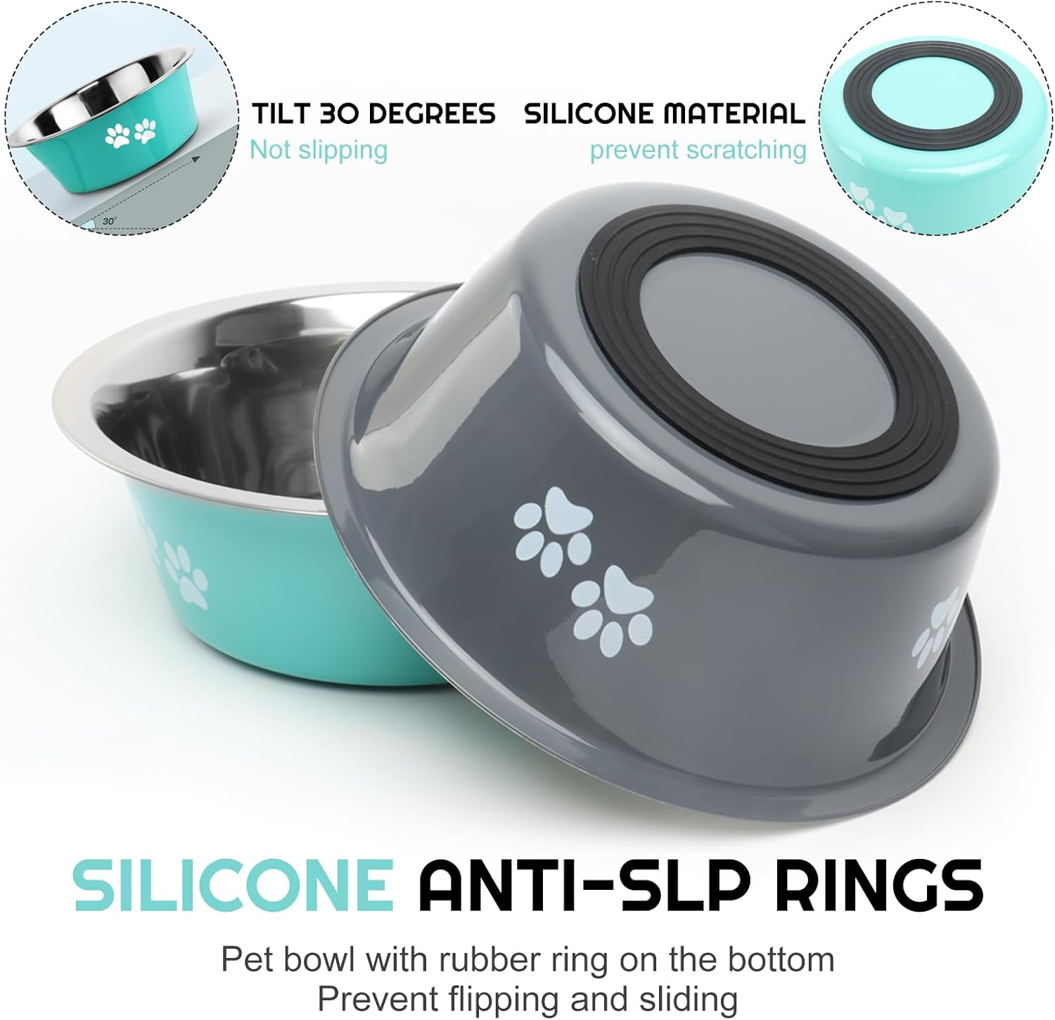 • ๐๐จ๐ง-๐ฌ๐ฅ๐ข๐ฉ&๐๐จ๐ง-๐ง๐จ๐ข๐ฌ๐ž: The no-smell silicone base under dog bowls not only protects your floor, but also prevents the bowl from sliding or making noise when your pet is feeding or watering.