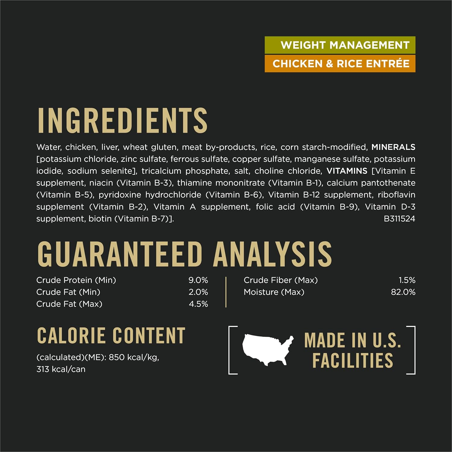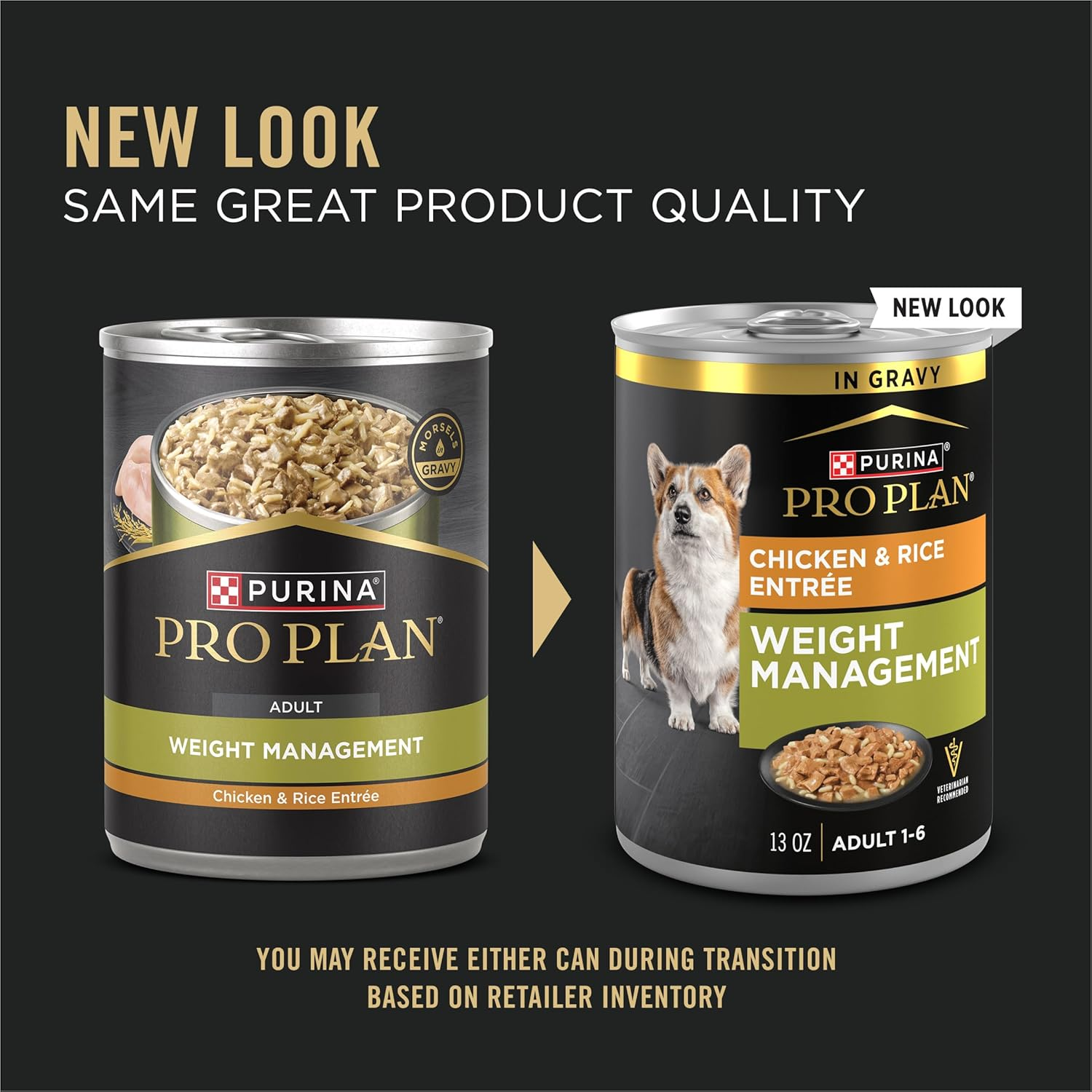 Help your dog maintain a healthy weight with Purina Pro Plan Weight Management Chicken and Rice Entrée in Gravy wet adult dog food. Made with real chicken, for a taste dogs love, this high protein dog food helps your pal maintain muscle mass during weight loss. Every serving of this Purina Pro Plan Weight Management dog food is ideal for overweight or less active dogs with 25 percent less fat than Pro Plan Complete Essentials Classic Chicken and Rice Entree adult dog food. Plus, the weight management dog food formula helps support a healthy immune system and nourishes his healthy skin and coat. And to ensure this wet food for dogs gives your dog only what he needs and nothing he doesn’t, it’s made with no artificial colors, flavors or preservatives. Help your dog achieve a healthy weight by filling his bowl with Purina Pro Plan Weight Management Chicken and Rice Entree in Gravy wet adult dog food.