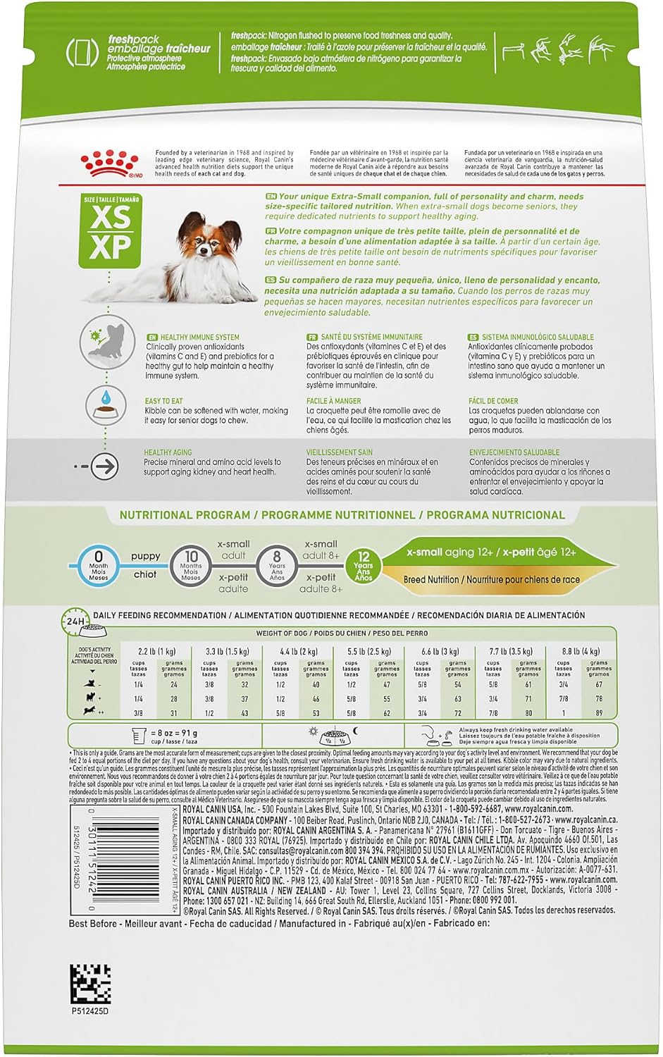 - X-SMALL BREED DOG FOOD: Royal Canin X-Small Aging 12+ Dry Dog Food is precise nutrition specifically made for toy and miniature breed senior dogs over 12 years old that weigh up to 8 lb